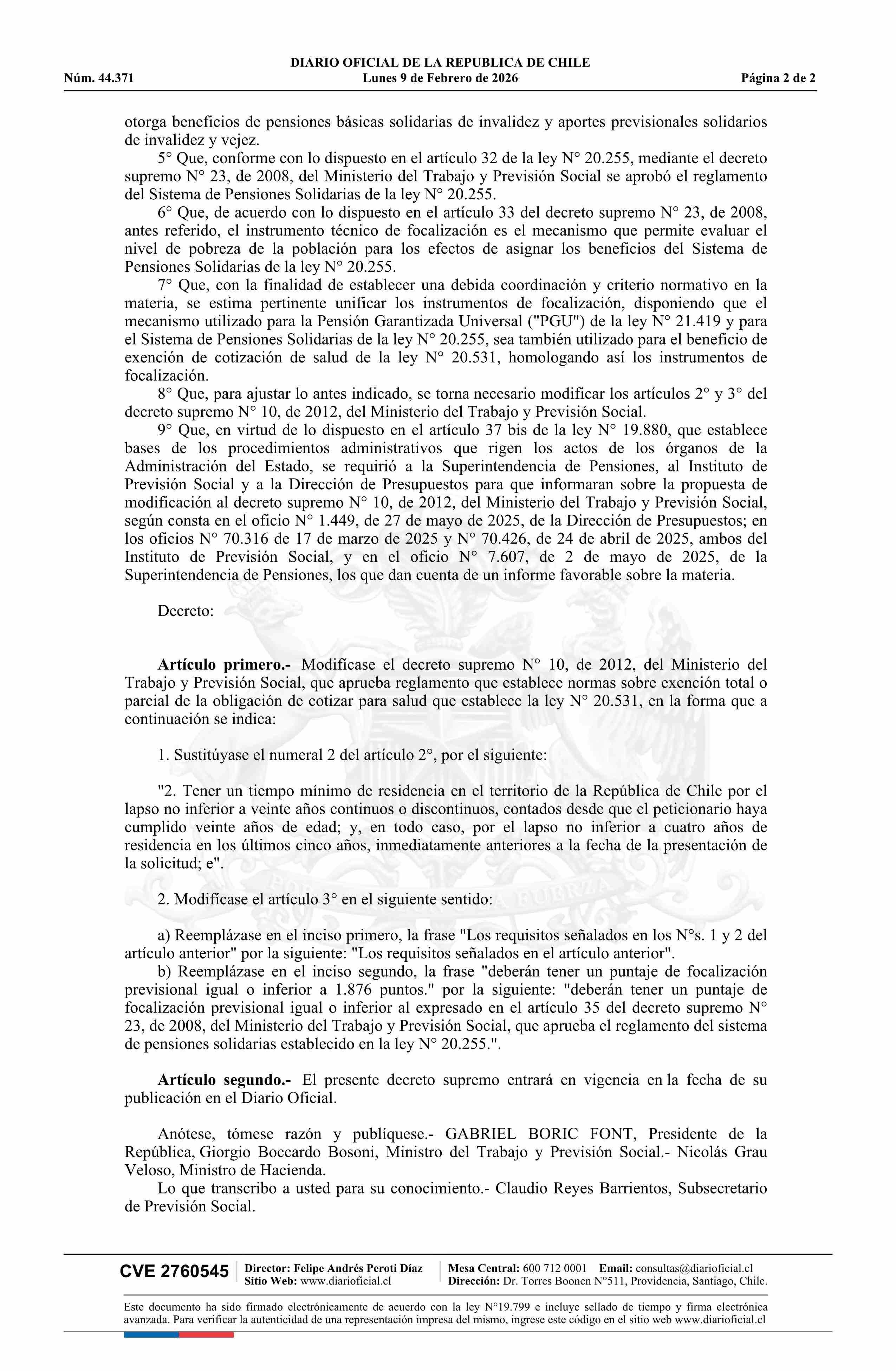 | Título: | Decreto número 60, de 2025.- Modifica decreto N° 10, de 2012, que aprueba reglamento que establece normas sobre exención total o parcial de la obligación de cotizar para salud que establece la ley N° 20.531 |