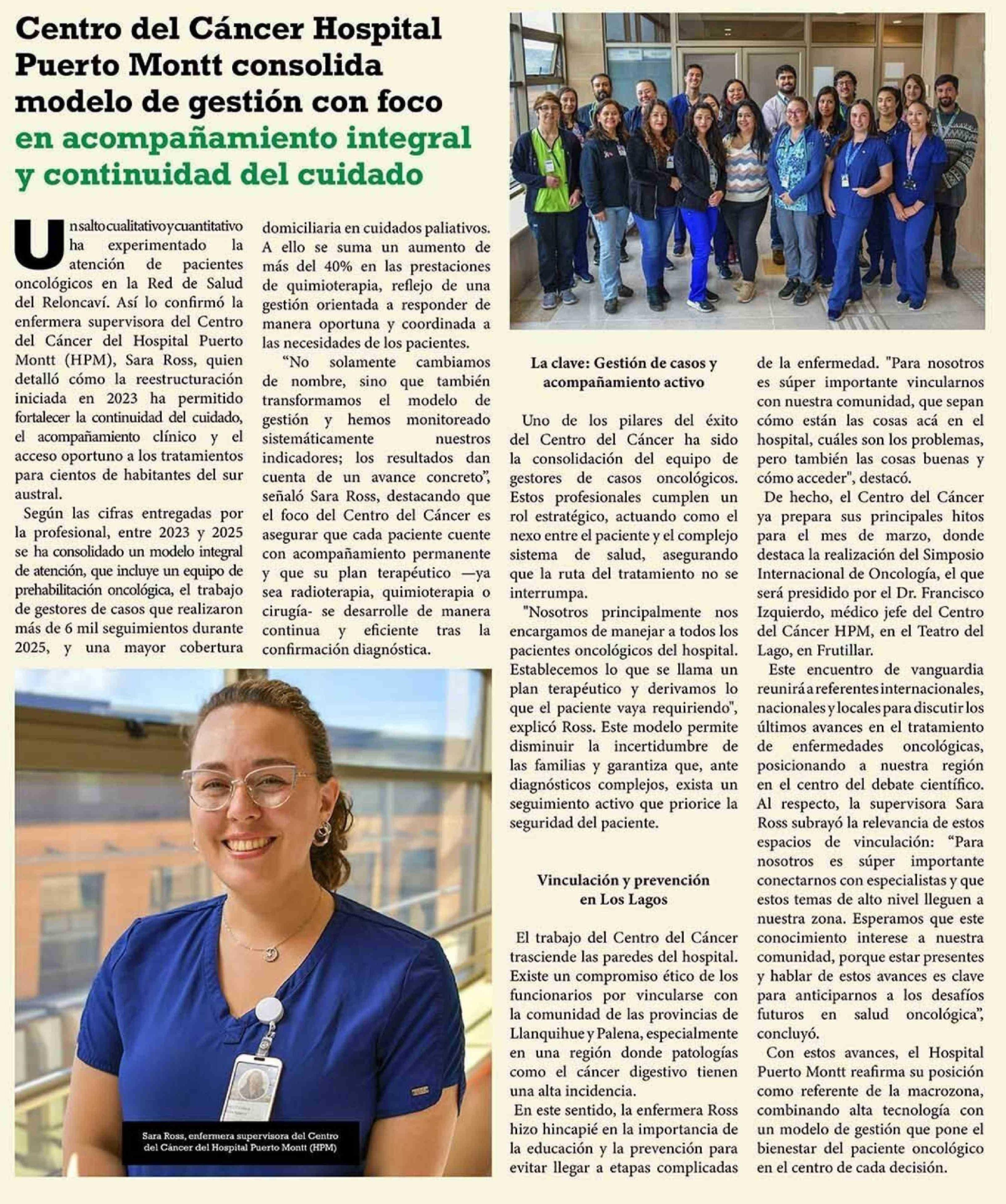 Centro del Cáncer Hospital Puerto Montt consolida modelo de gestión con foco en acompañamiento integral y continuidad del cuidado 12-02-2026 El Heraldo Austral |