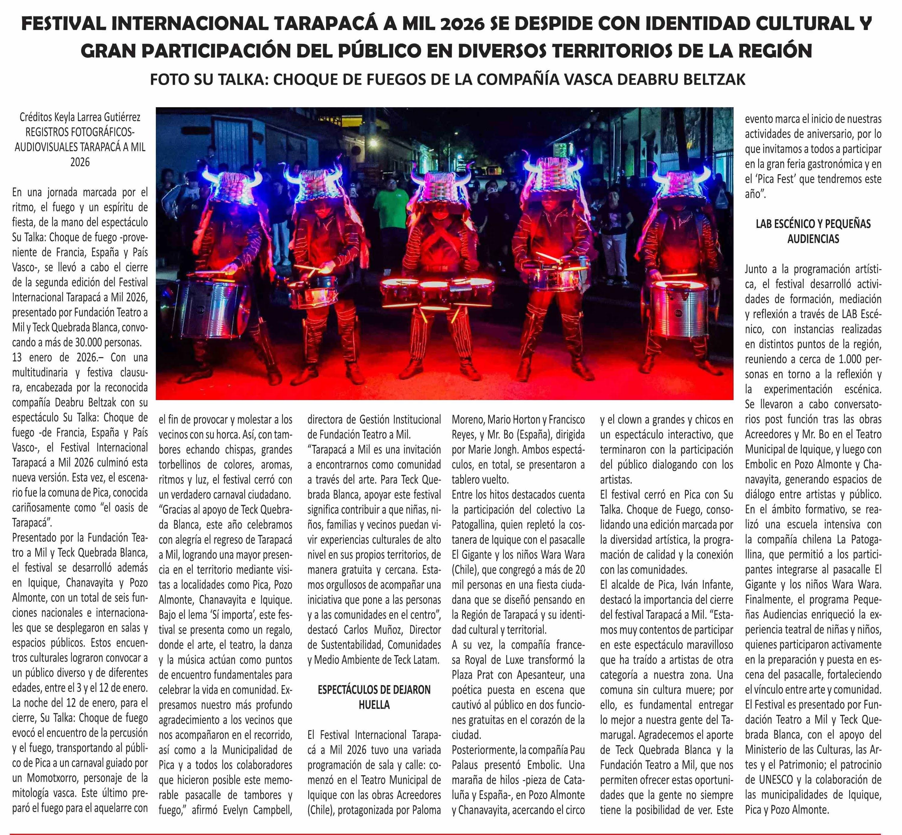 Título: FESTIVAL INTERNACIONAL TARAPACÁ A MIL 2026 SE DESPIDE CON IDENTIDAD CULTURAL Y GRAN PARTICIPACIÓN DEL PÚBLICO EN DIVERSOS TERRITORIOS DE LA REGIÓN FOTO SU TALKA: CHOQUE DE FUEGOS DE LA COMPAÑÍA VASCA DEABRU BELTZAK