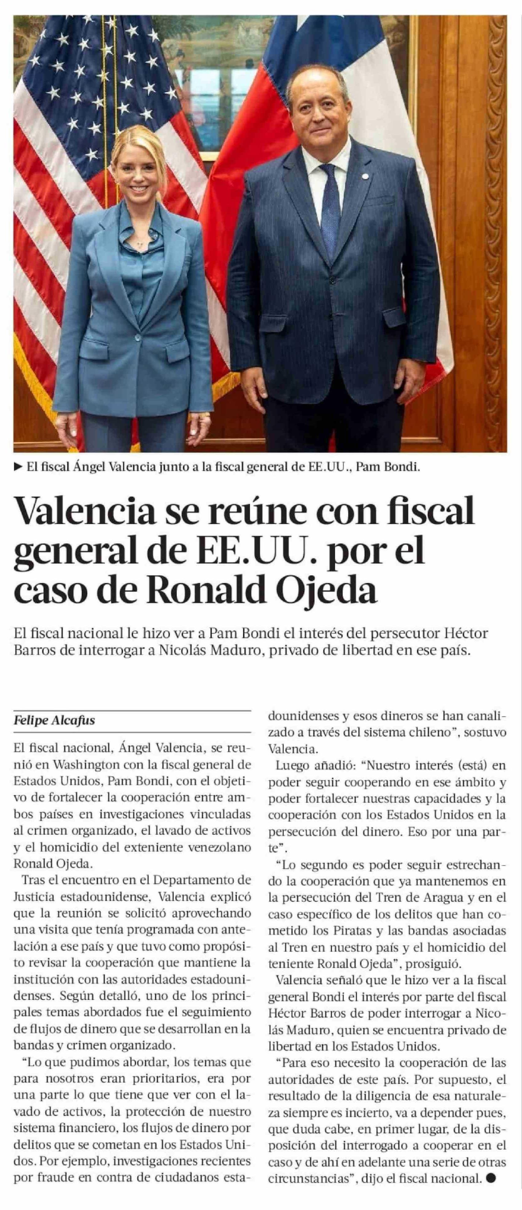 Valencia se reúne con fiscal general de EE.UU. por el caso de Ronald Ojeda 17-03-2026 La Tercera |