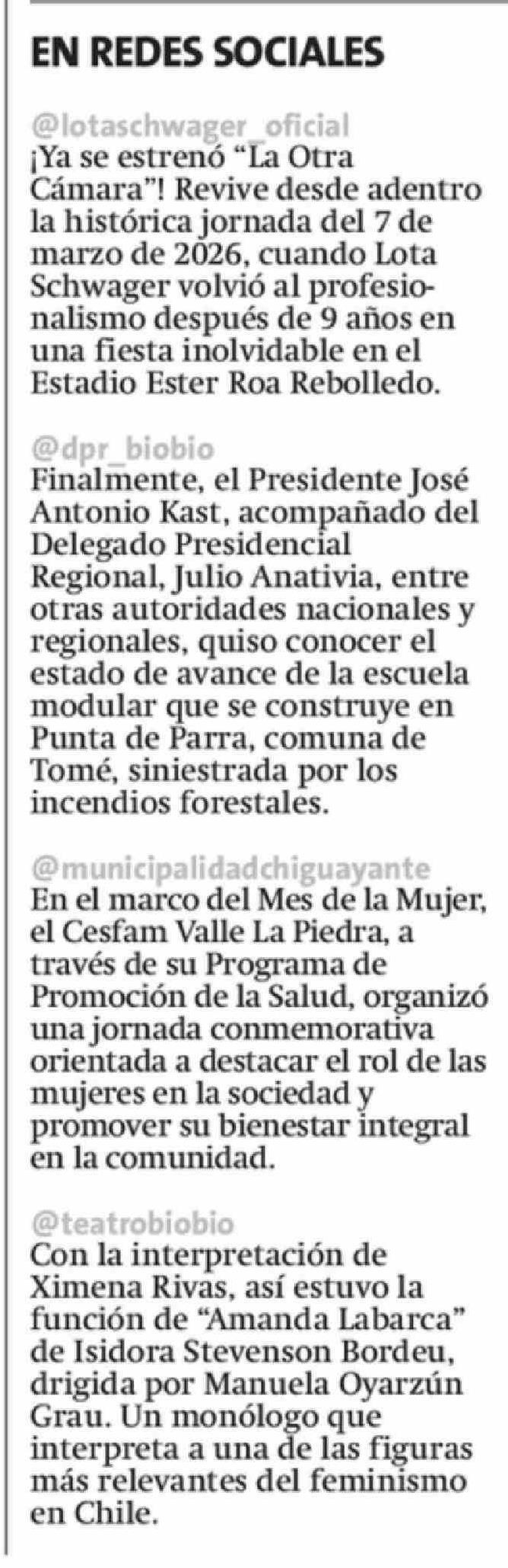 EN REDES SOCIALES 16-03-2026 La Estrella de Concepción |
