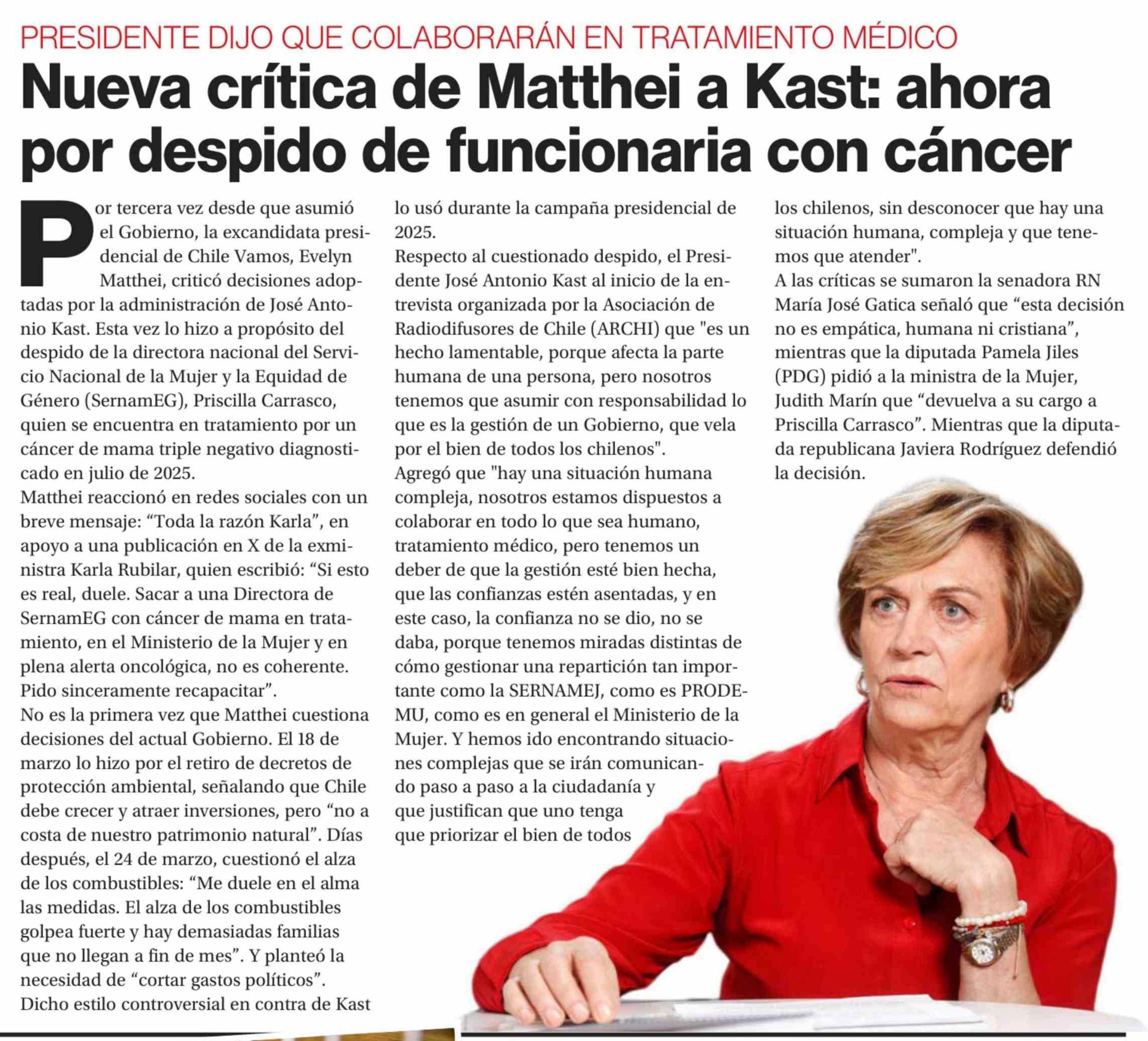 Nueva crítica de Matthei a Kast: ahora por despido de funcionaria con cáncer 31-03-2026 La Segunda |