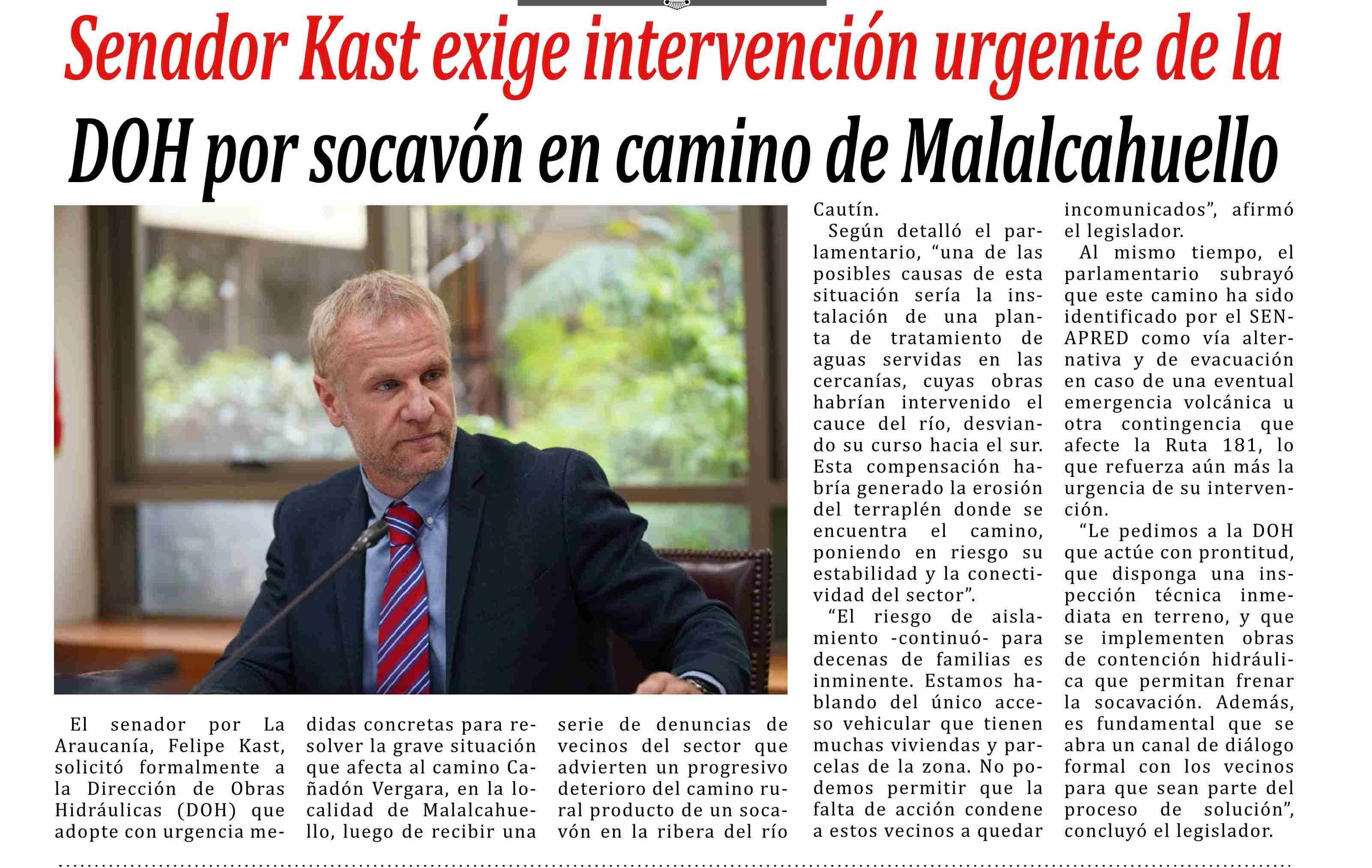 | Título: | Senador Kast exige intervención urgente de la DOH por socavón en camino de Malalcahuello |