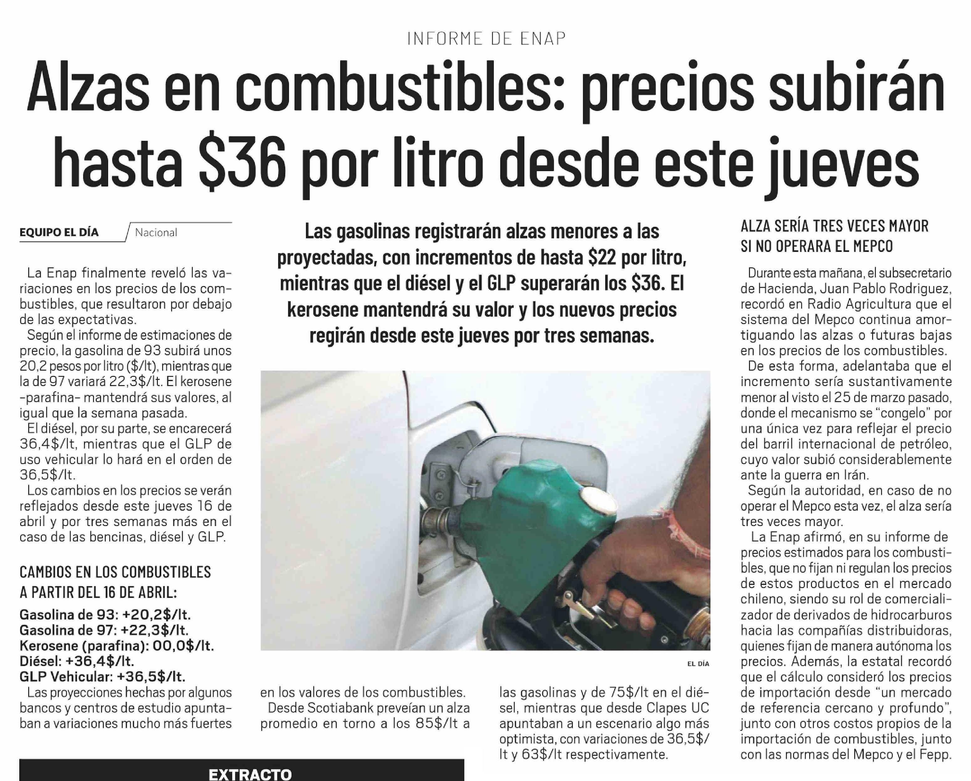 Título: Alzas en combustibles: precios subirán hasta $36 por litro desde este jueves
