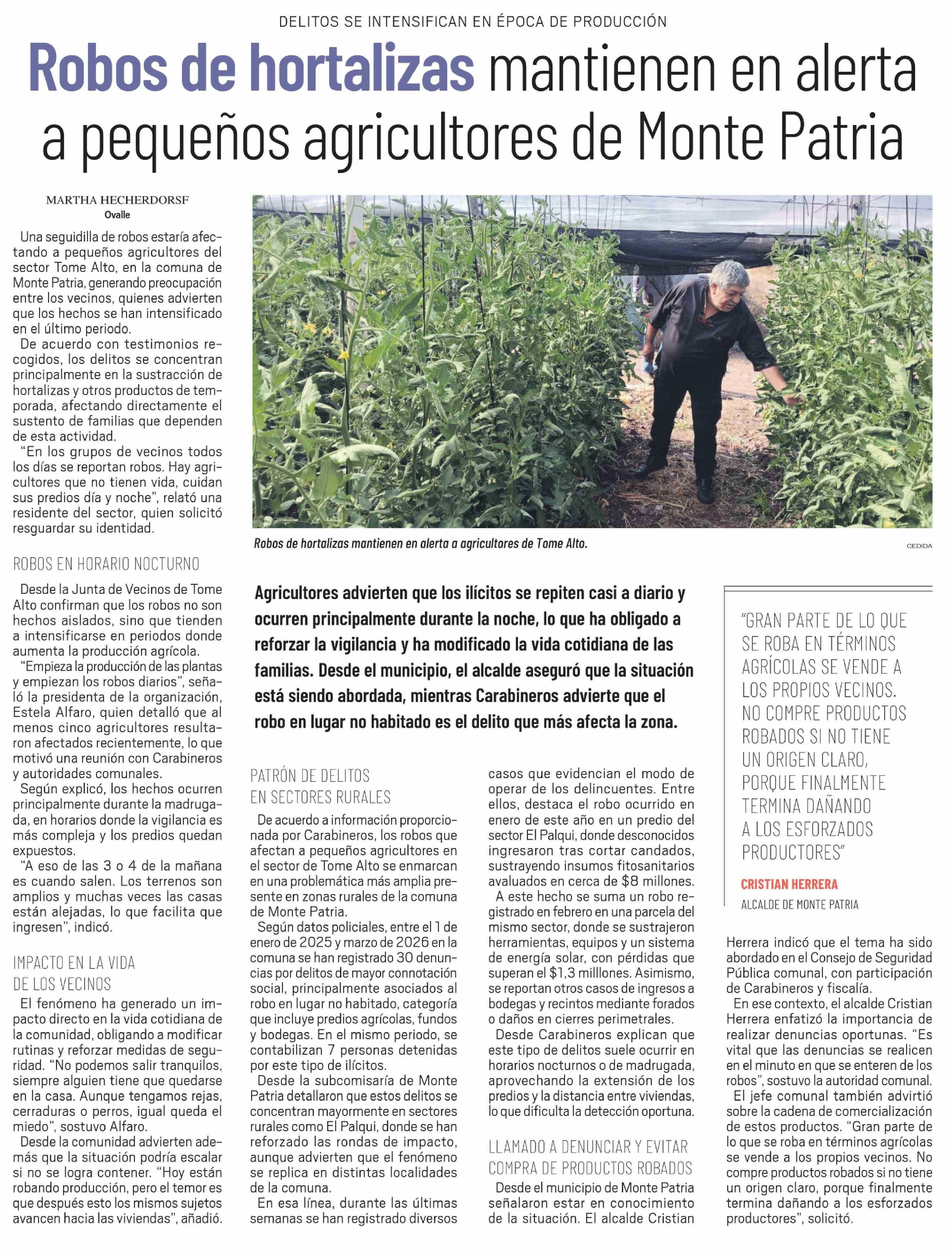 Título: Robos de hortalizas mantienen en alerta a pequeños agricultores de Monte Patria
