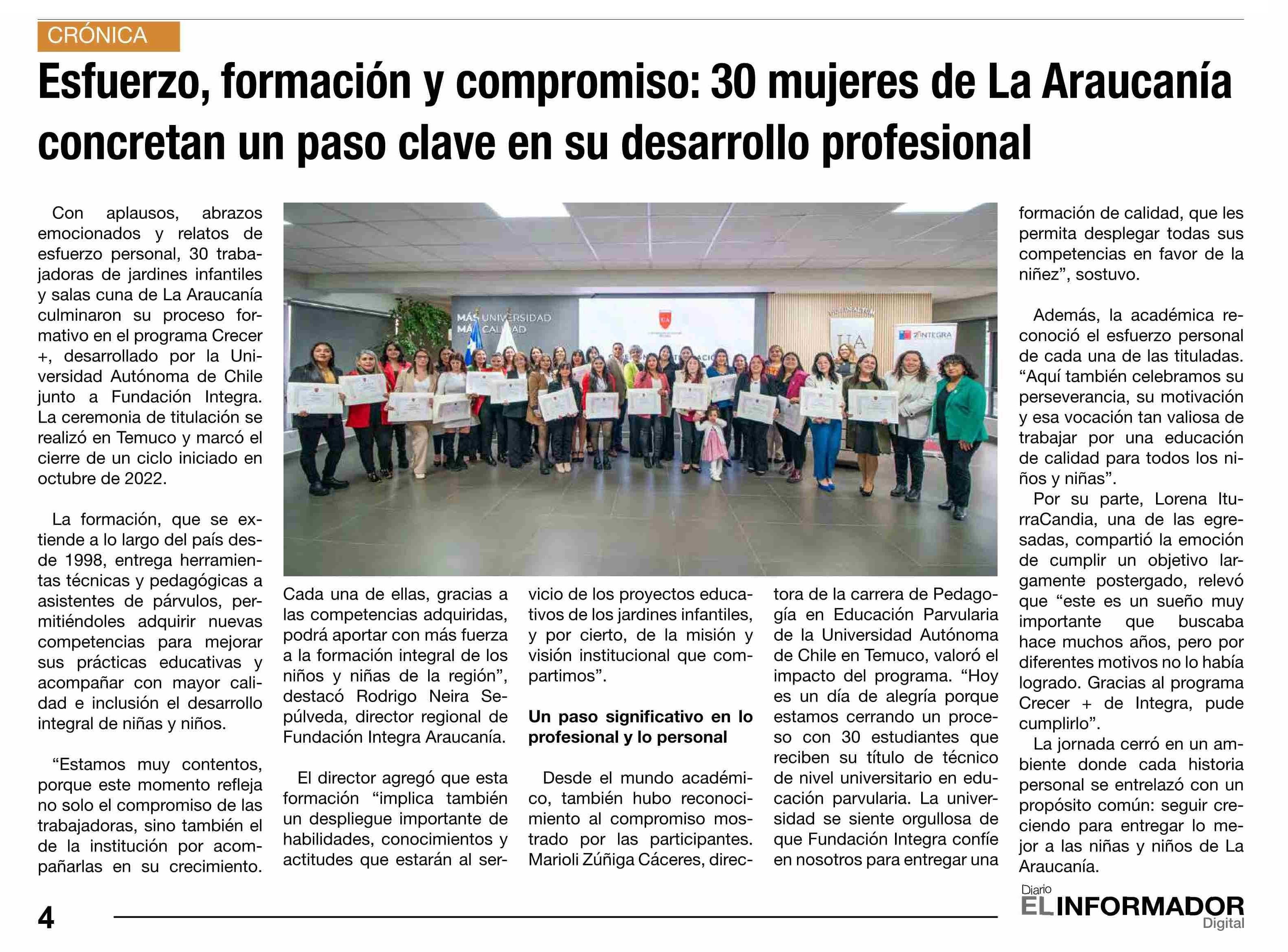 Esfuerzo, formación y compromiso: 30 mujeres de La Araucanía concretan un paso clave en su desarrollo profesional 15-05-2025 El Informador |