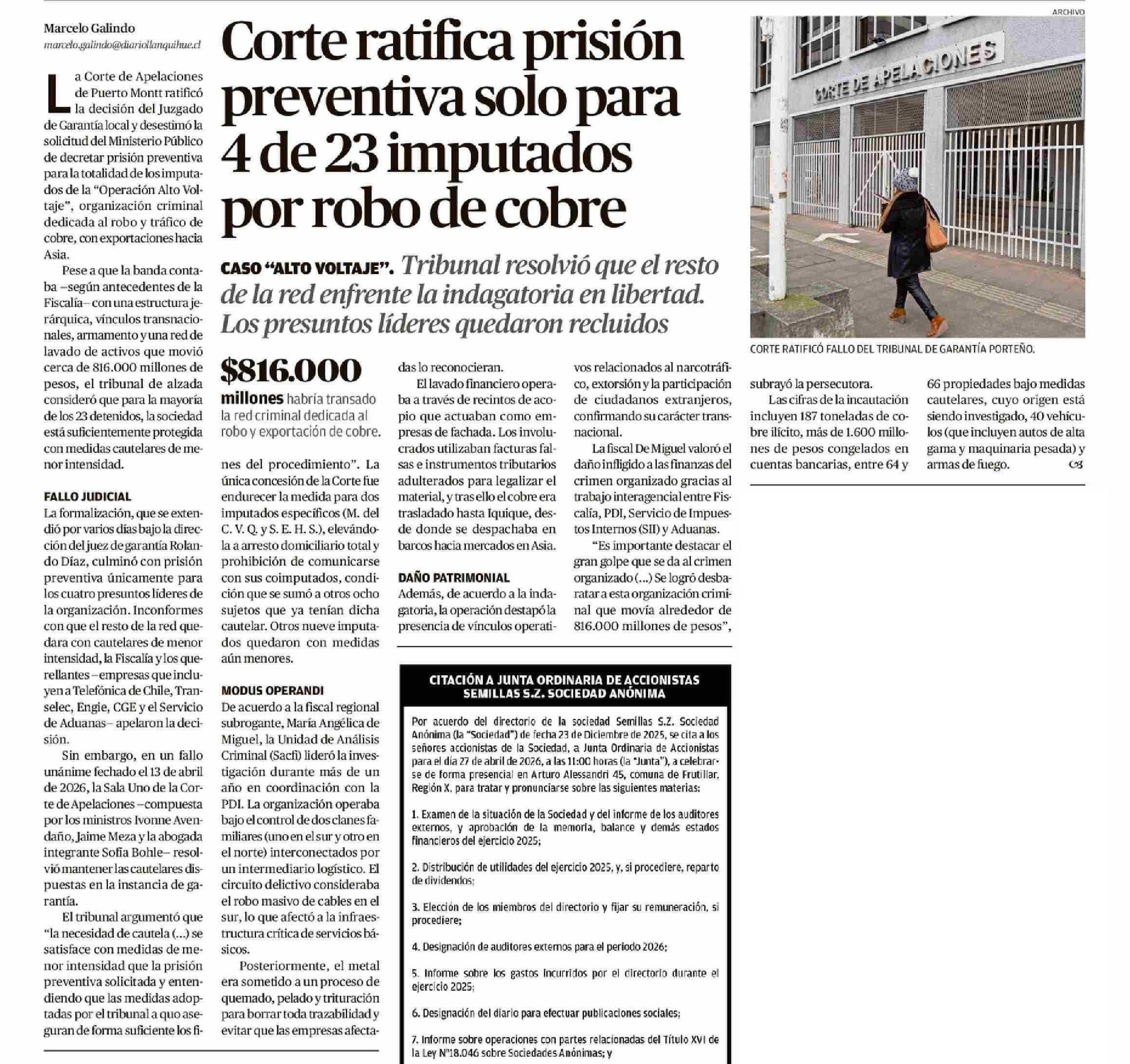 Corte ratilica prisión preventiva solo para 4 de 23 imputados por robo de cobre 15-04-2026 El Llanquihue |