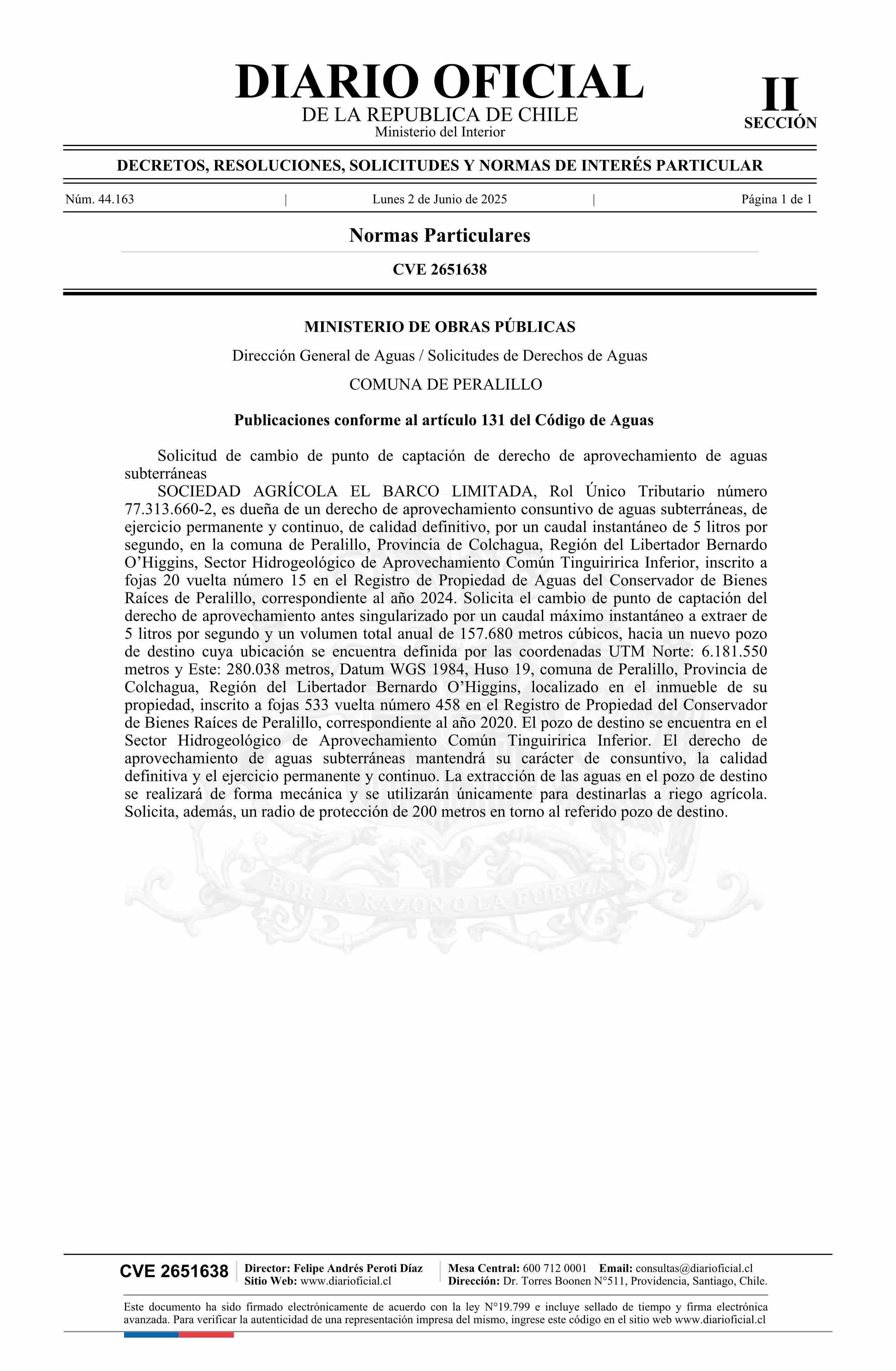 Solicitud Sociedad Agrícola El Barco Limitada 02-06-2025 Diario Oficial Edición Electrónica |