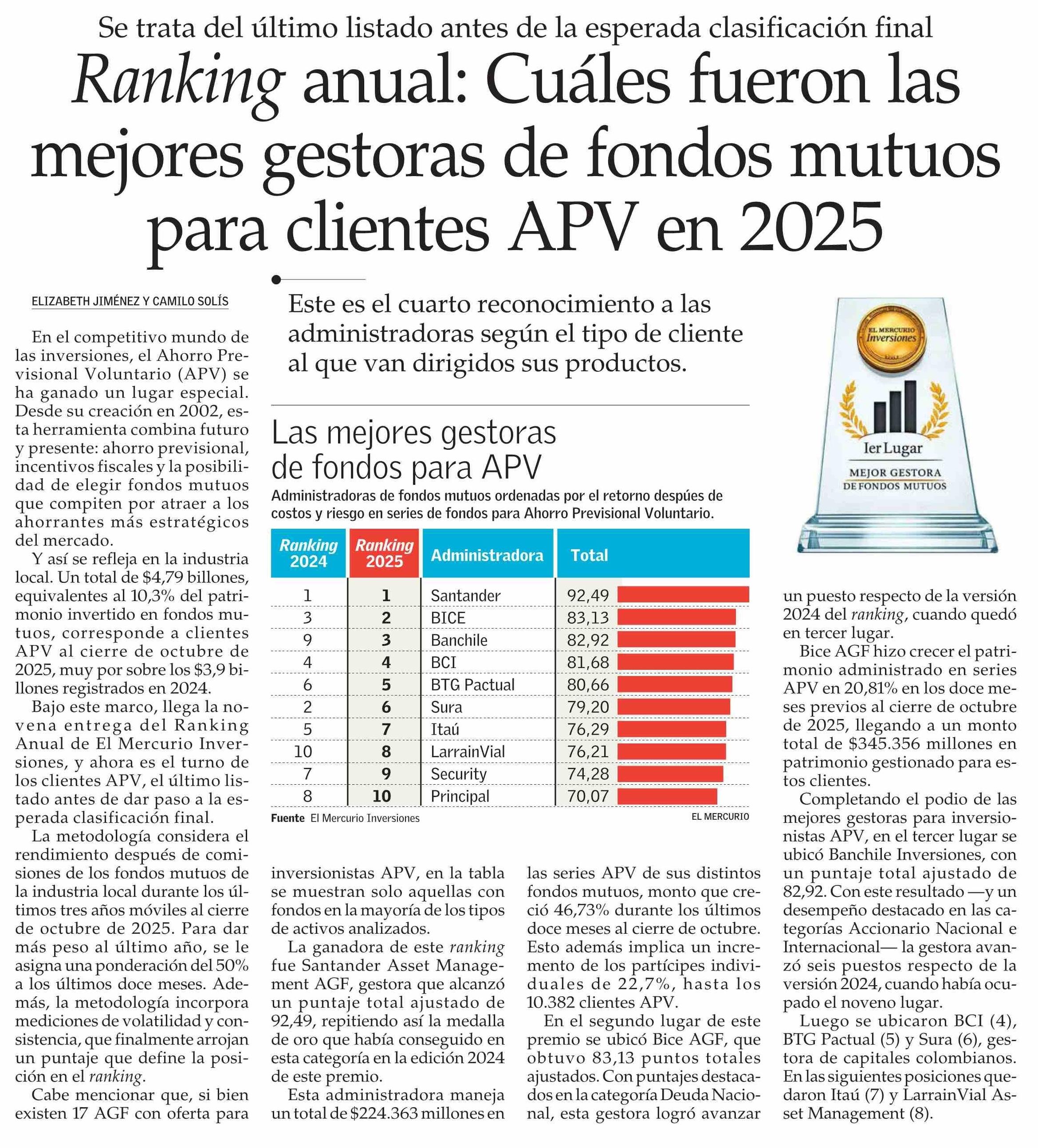 Ranking anual: Cuáles fueron las mejores gestoras de fondos mutuos para clientes APV en 2025 14-01-2026 El Mercurio |
