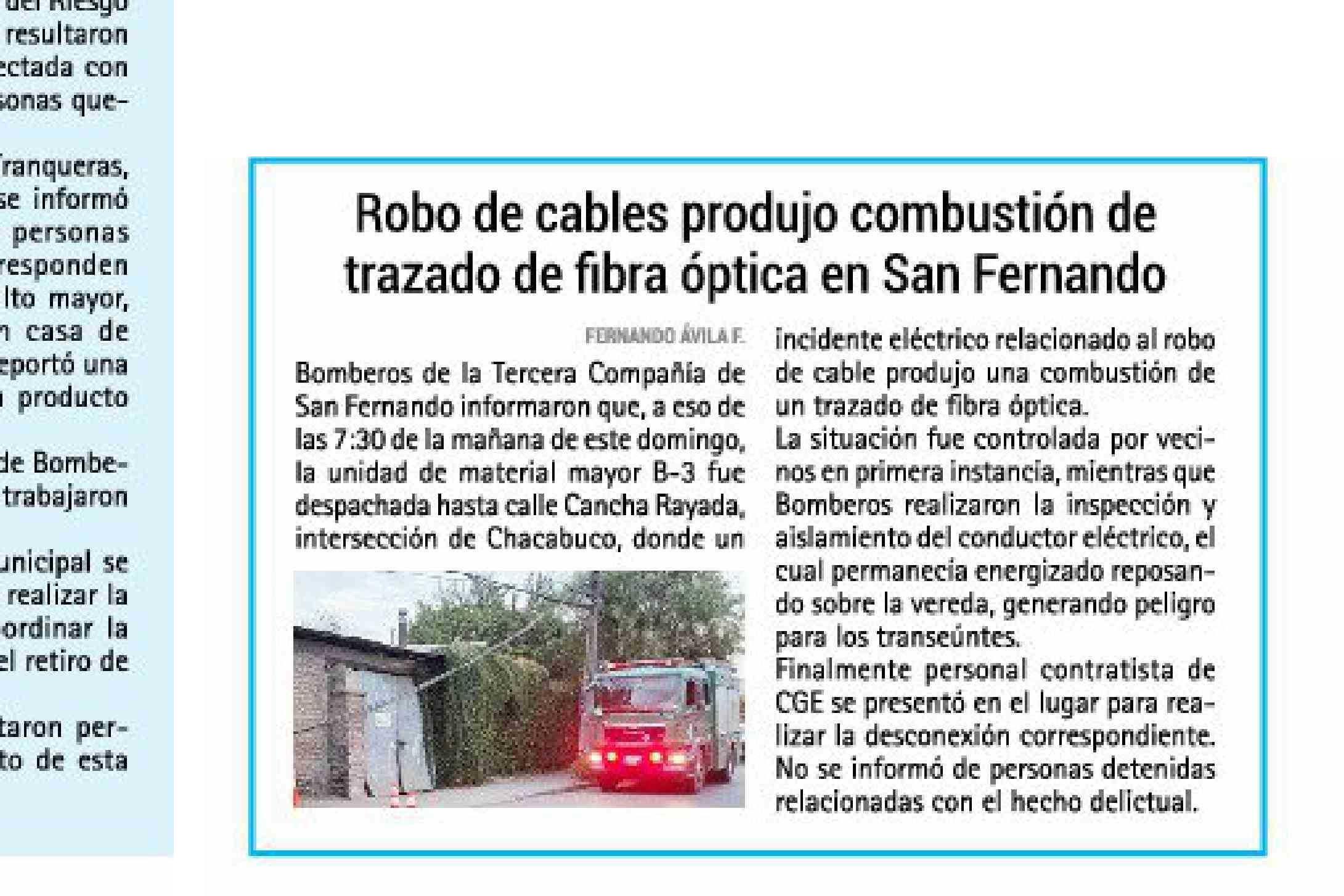| Título: | Robo de cables produjo combustión de trazado de fibra óptica en San Fernando |