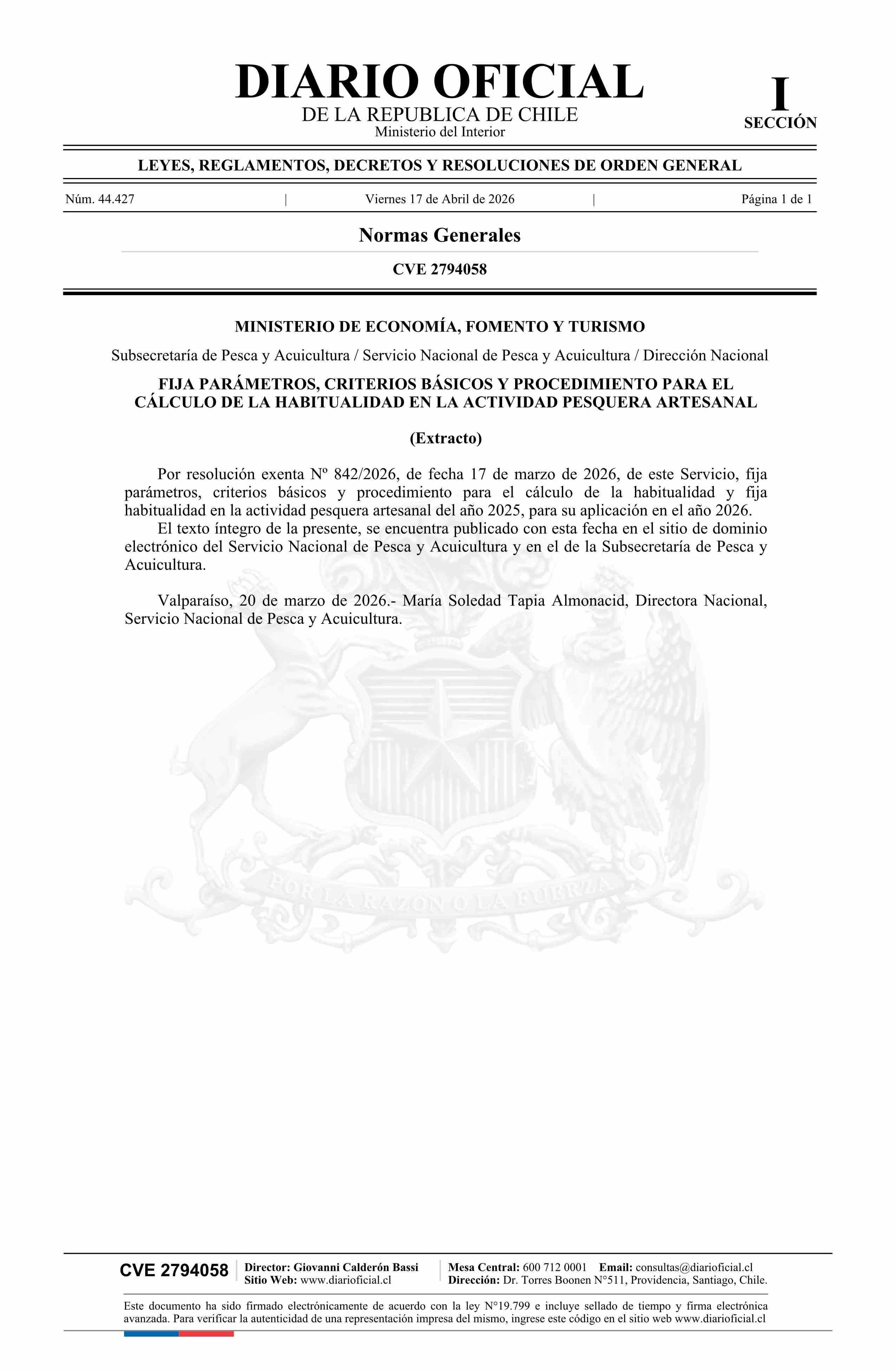 Título: Extracto de resolución exenta número 842, de 2026.- Fija parámetros, criterios básicos y procedimiento para el cálculo de la habitualidad en la actividad pesquera artesanal