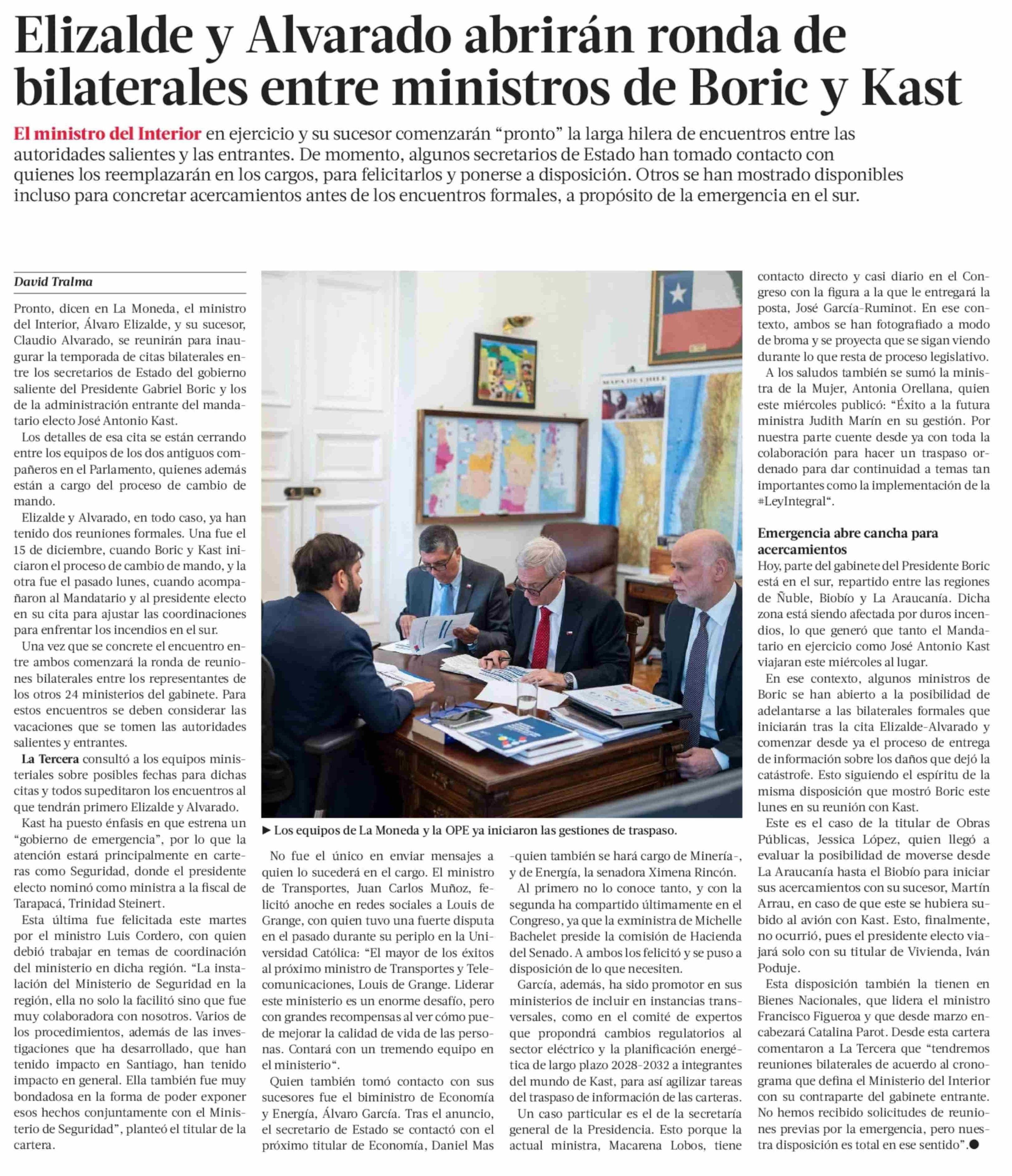 Elizalde y Alvarado abrirán ronda de bilaterales entre ministros de Boric y Kast 22-01-2026 La Tercera |