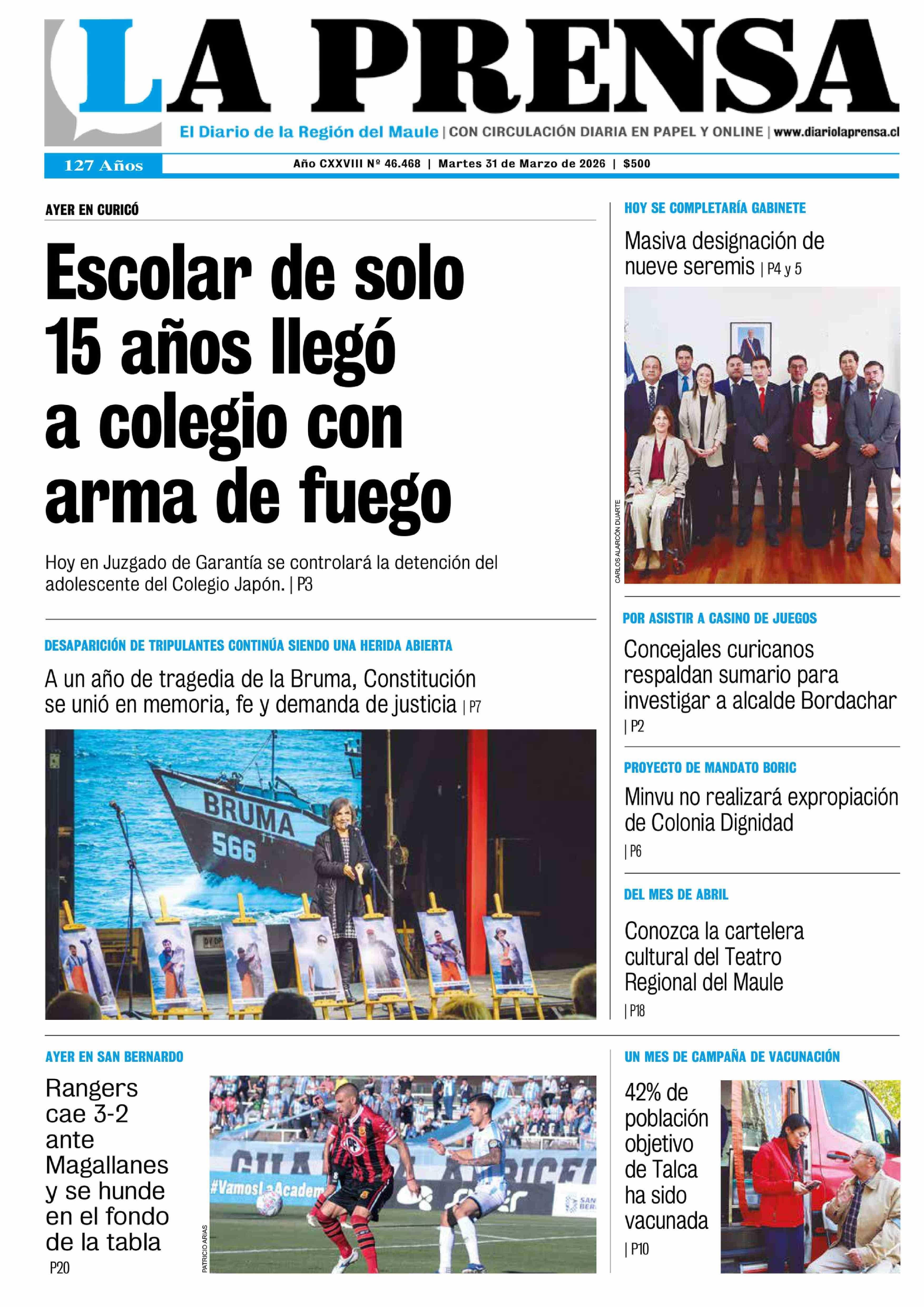 PORTADA LA PRENSA DE CURICÓ CHILE 31-03-2026 La Prensa de Curicó |