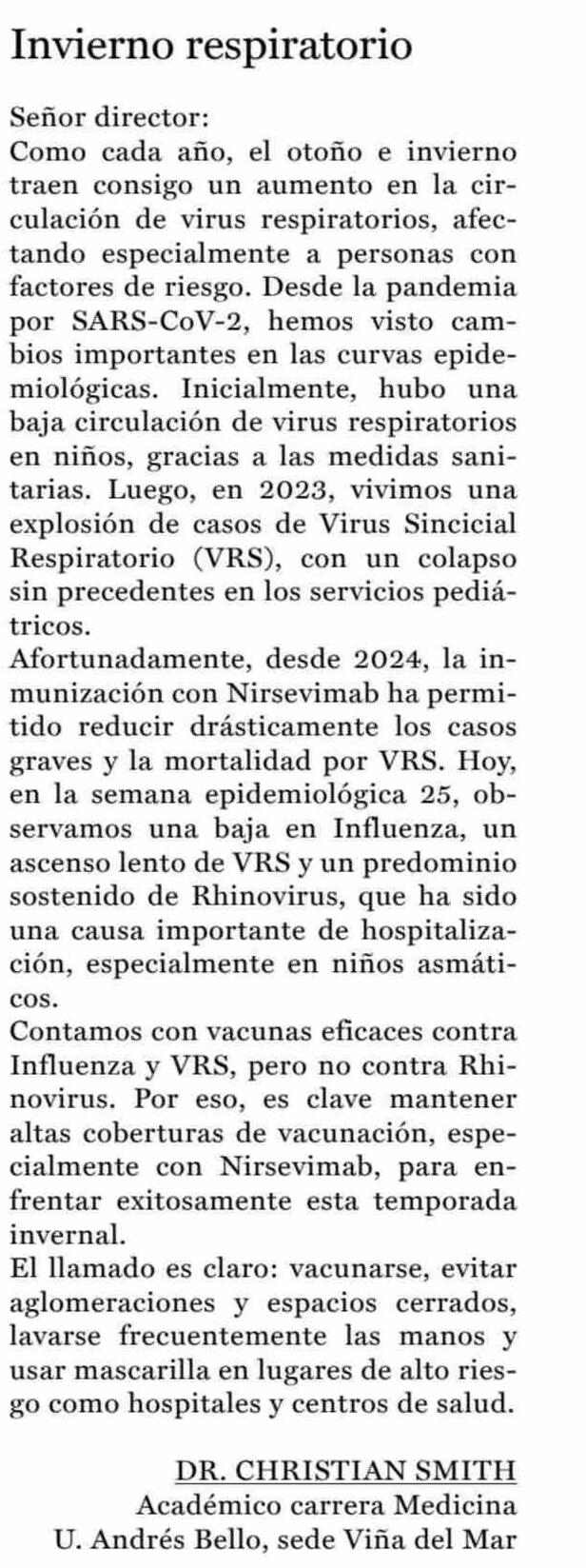 CARTAS: Invierno respiratorio 18-06-2025 La Prensa de Curicó |