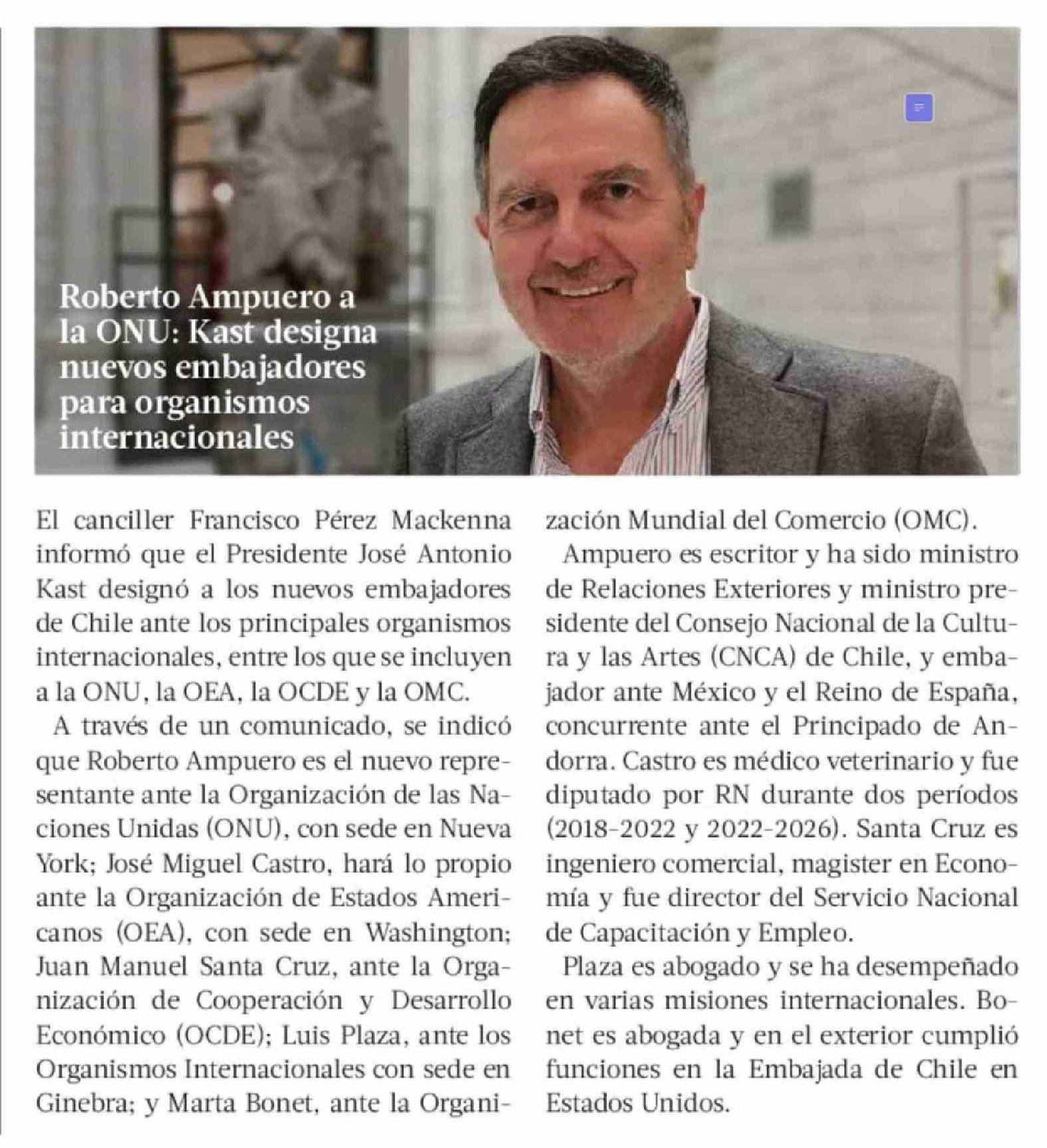 | Título: | Roberto Ampuero a la ONU: Kast designa nuevos embajadores para organismos internacionales |