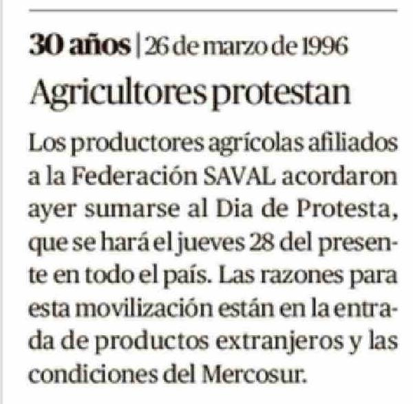 Título: 30 años | 26 de marzo de 1996 Agricultores protestan Los productores agrícolas afiliados a la Federación SAVAL acordaron ayer sumarse al Dia de Protesta, que se hará el jueves 28 del presente en todo el país. Las razones para esta movilización están en la entrada de productos extranjeros y las condi