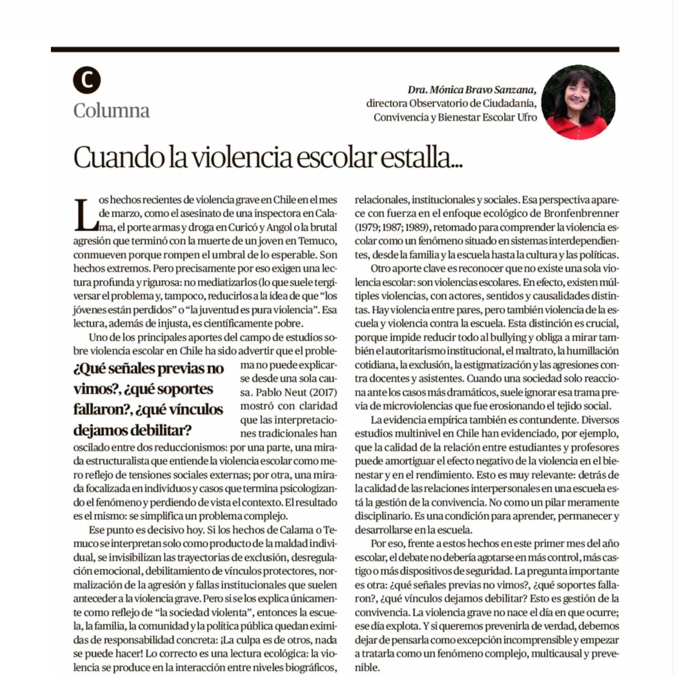 COLUMNAS DE OPINIÓN: Cuando la violencia escolar estalla... 03-04-2026 El Austral de la Araucanía |