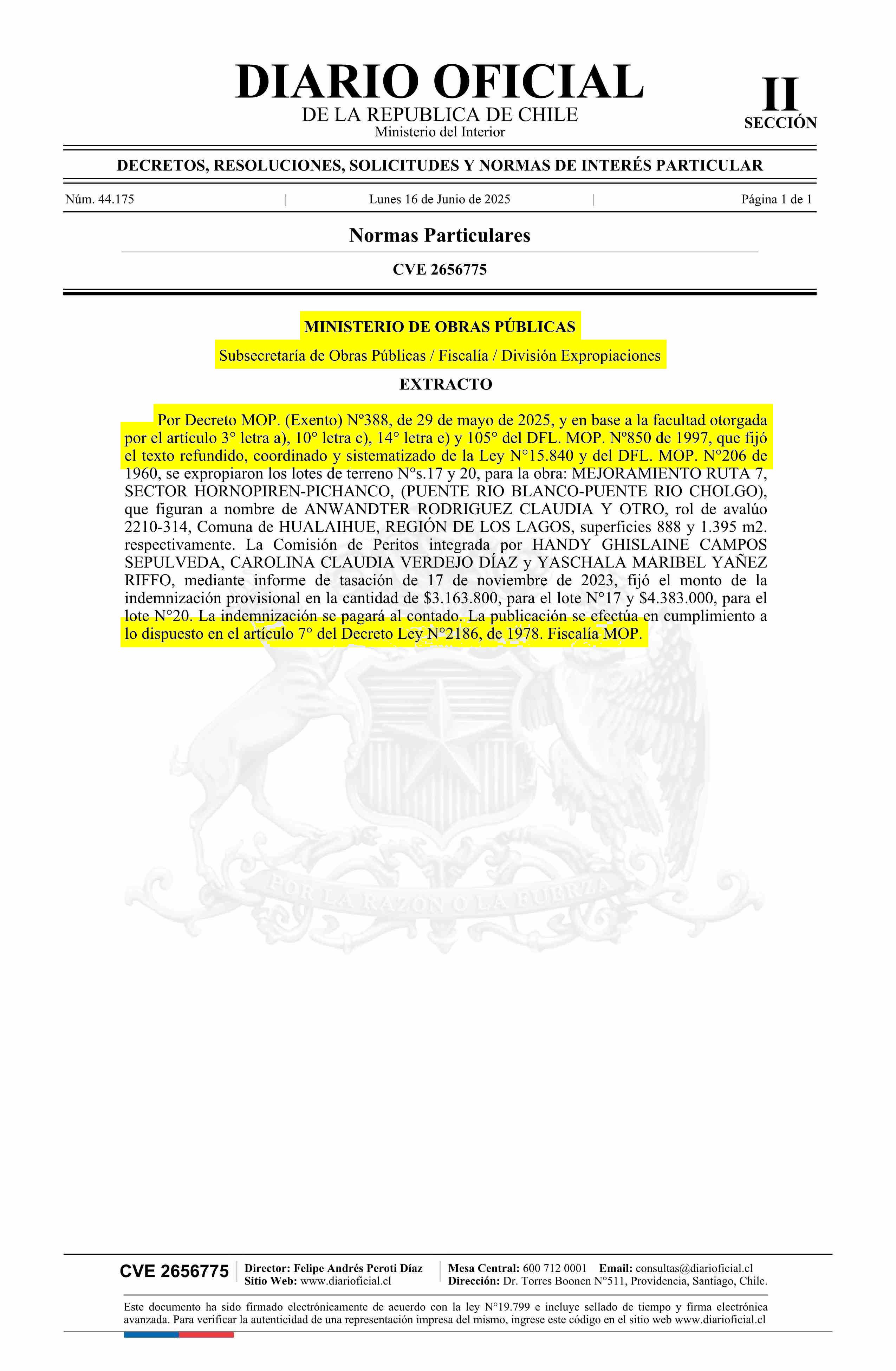 | Título: | Extracto de decreto exento número 388, de 2025.- Anwandter Rodríguez Claudia y otro |