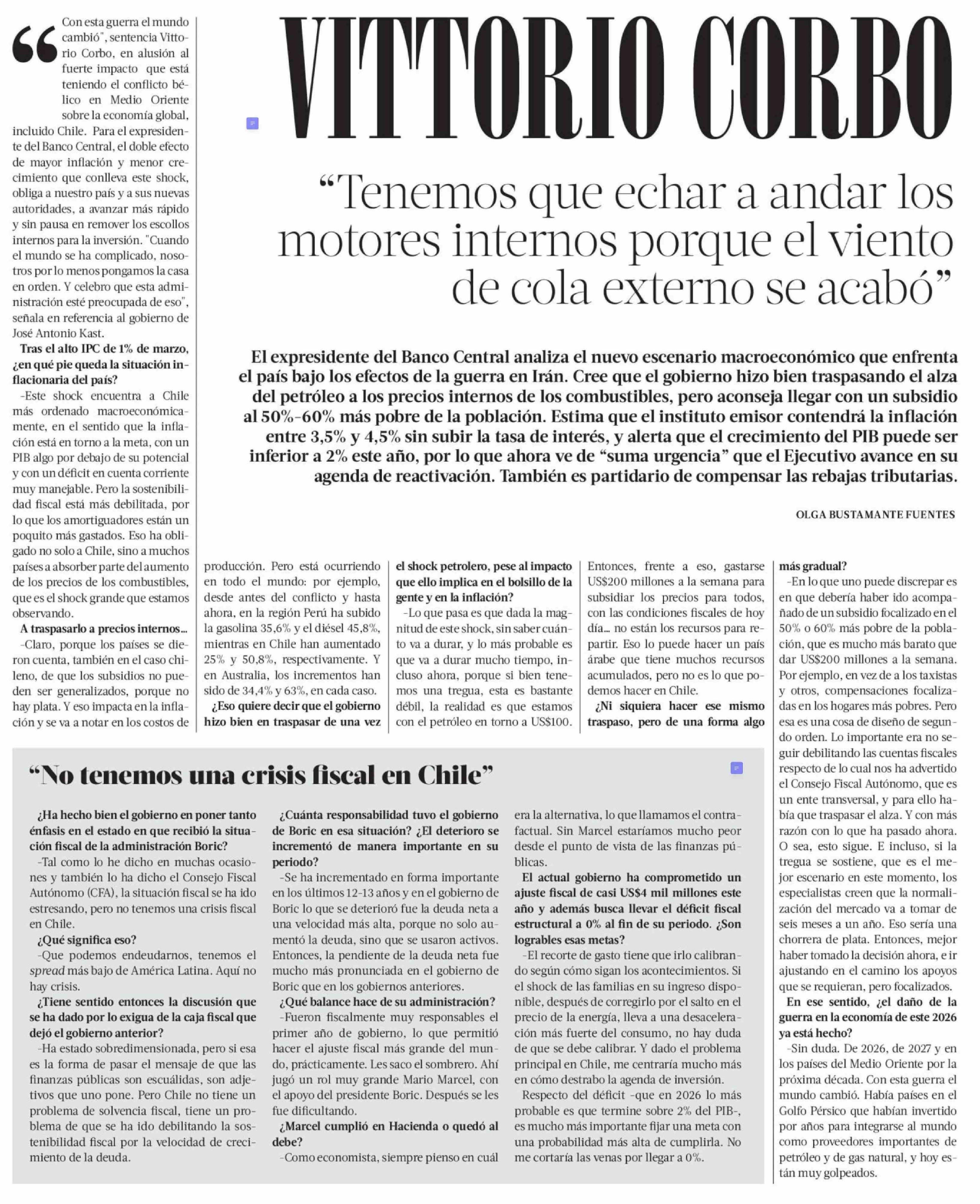 VITTORIO CORBO "Tenemos que echar a andar los motores internos porque el viento de cola externo se acabó" 12-04-2026 La Tercera |