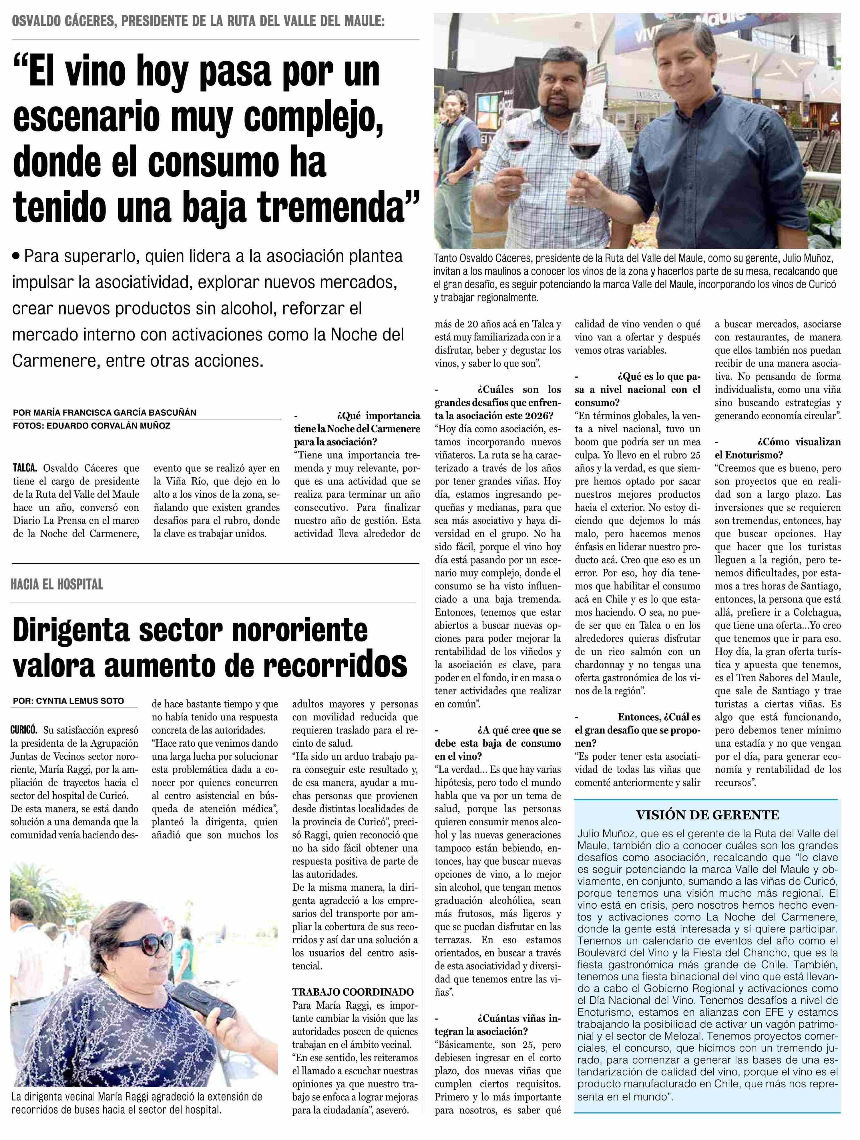 "El vino hoy pasa por un escenario muy complejo, donde el consumo ha tenido una baja tremenda" 18-01-2026 La Prensa de Curicó |
