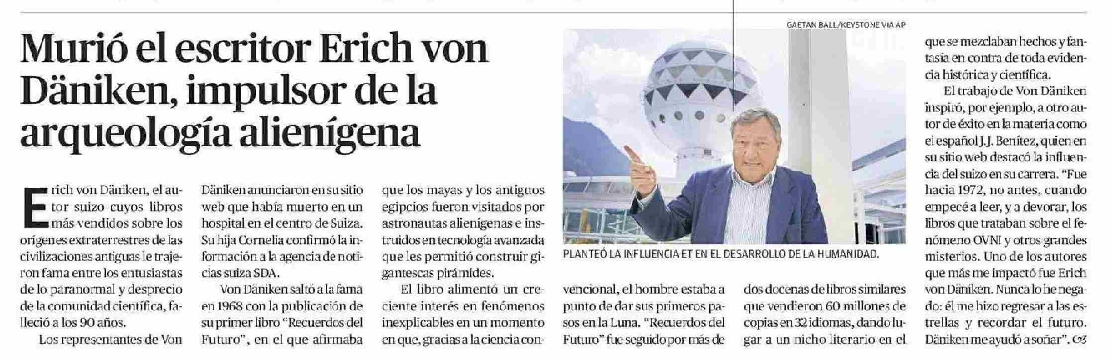 | Título: | Murió el escritor Erich von Däniken, impulsor de la arqueología alienígena |