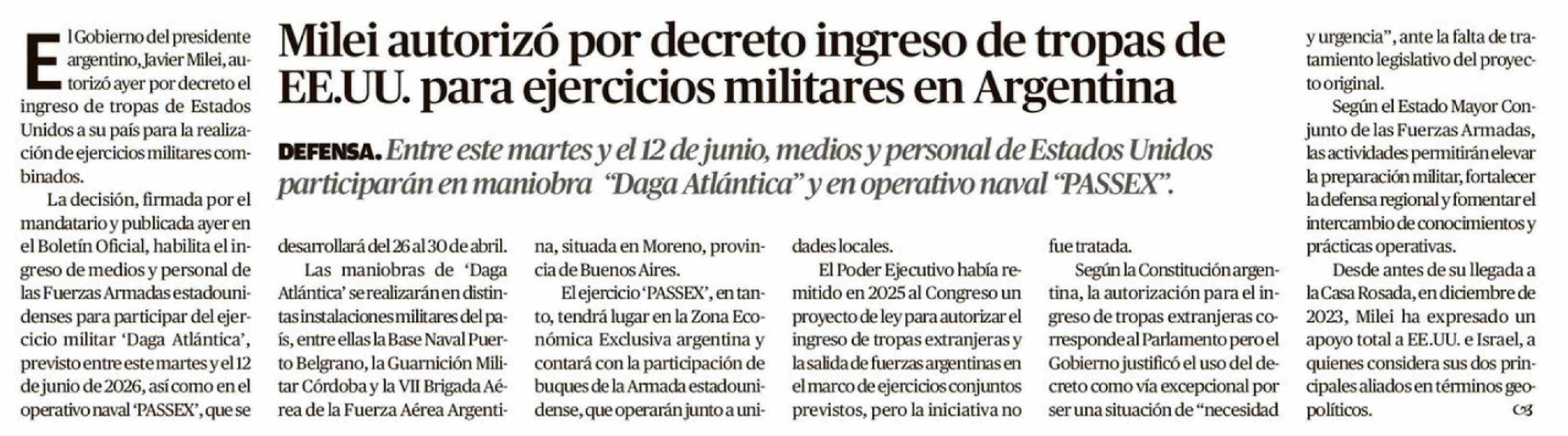 Milei autorizó por decreto ingreso de tropas de EE.UU. para ejercicios militares en Argentina 18-04-2026 El Austral de Osorno |