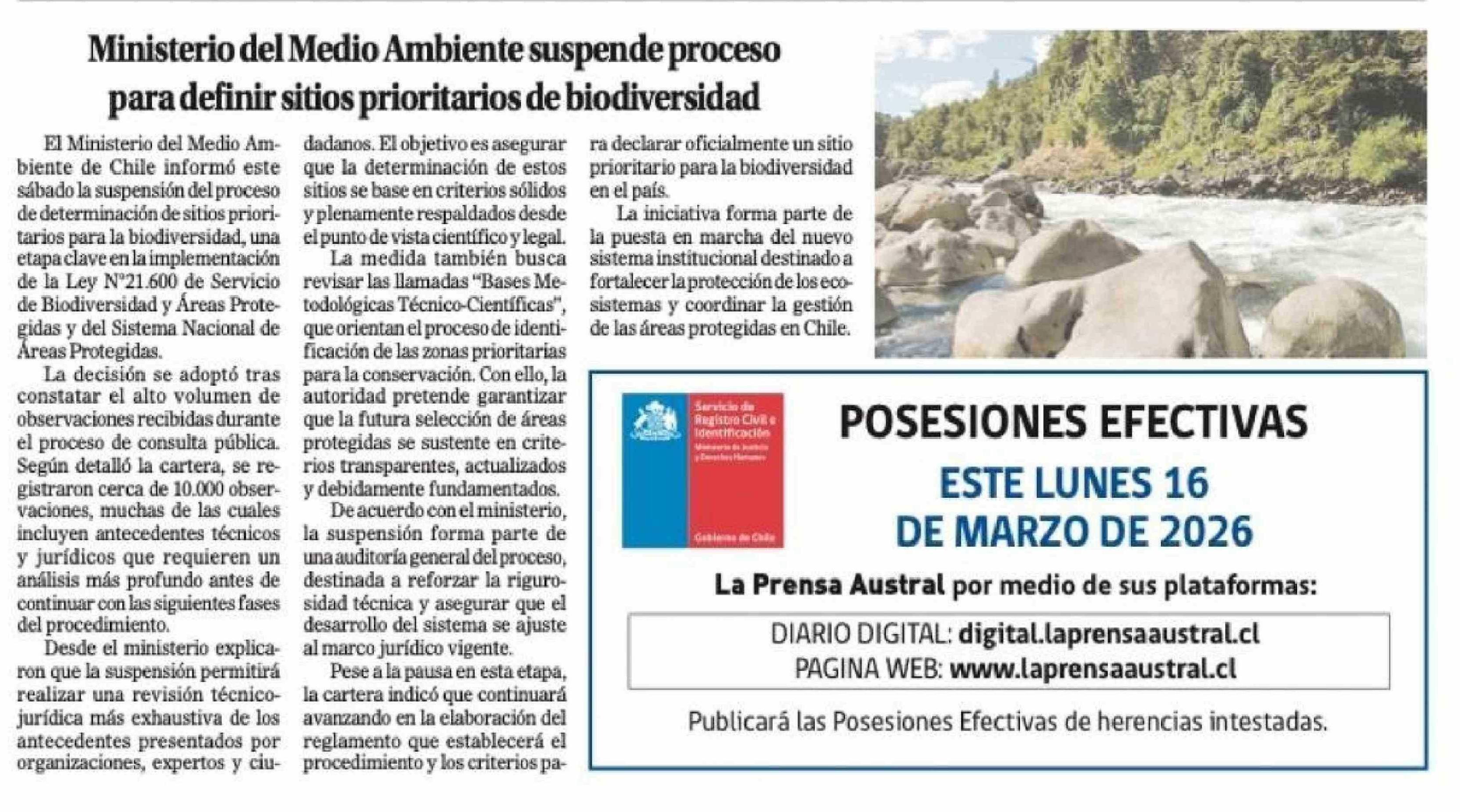 Ministerio del Medio Ambiente suspende proceso para definir sitios prioritarios de biodiversidad 15-03-2026 El Magallanes |