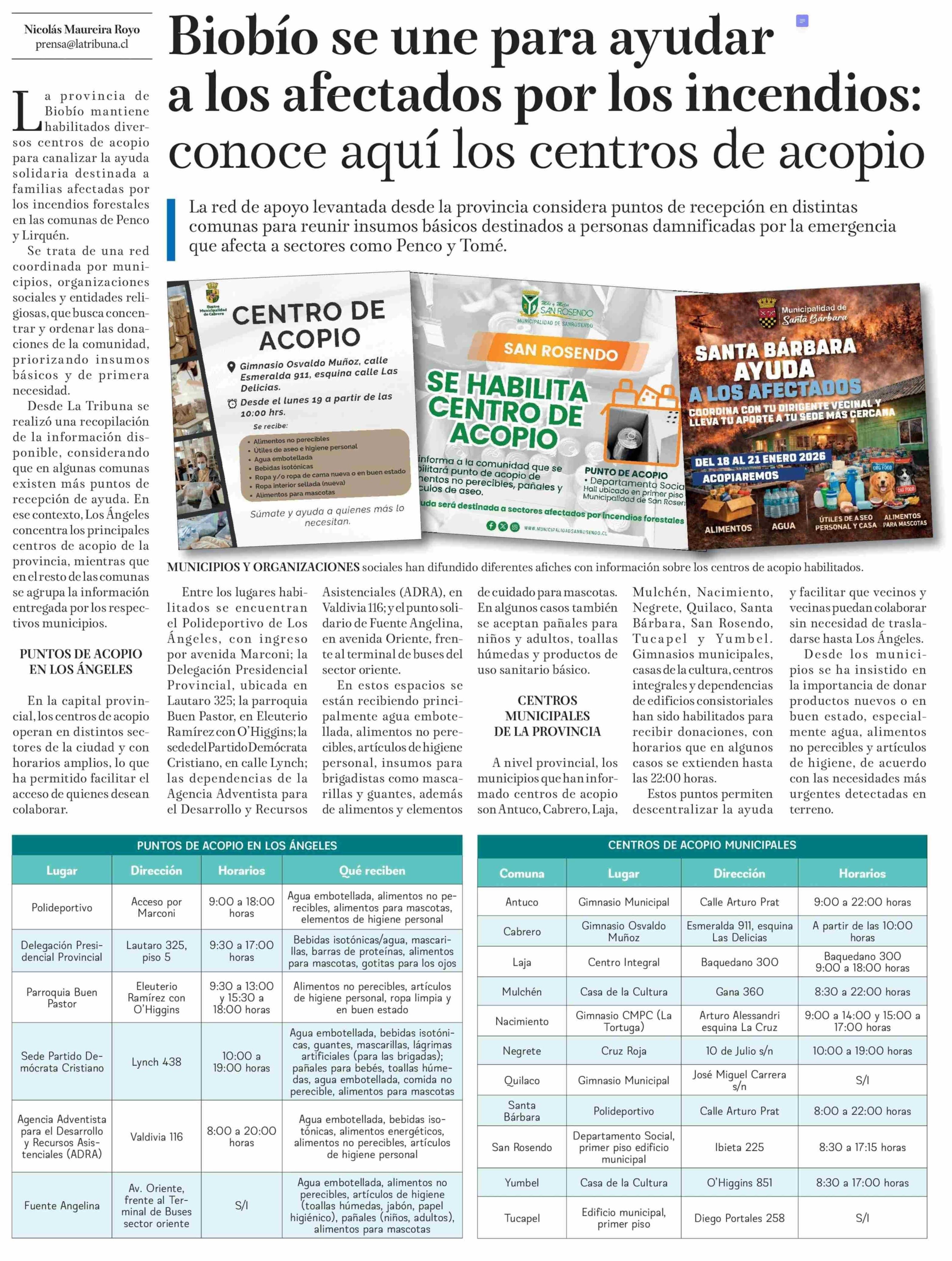 Biobío se une para ayudar a los afectados por los incendios: conoce aquí los centros de acopio 20-01-2026 La Tribuna |