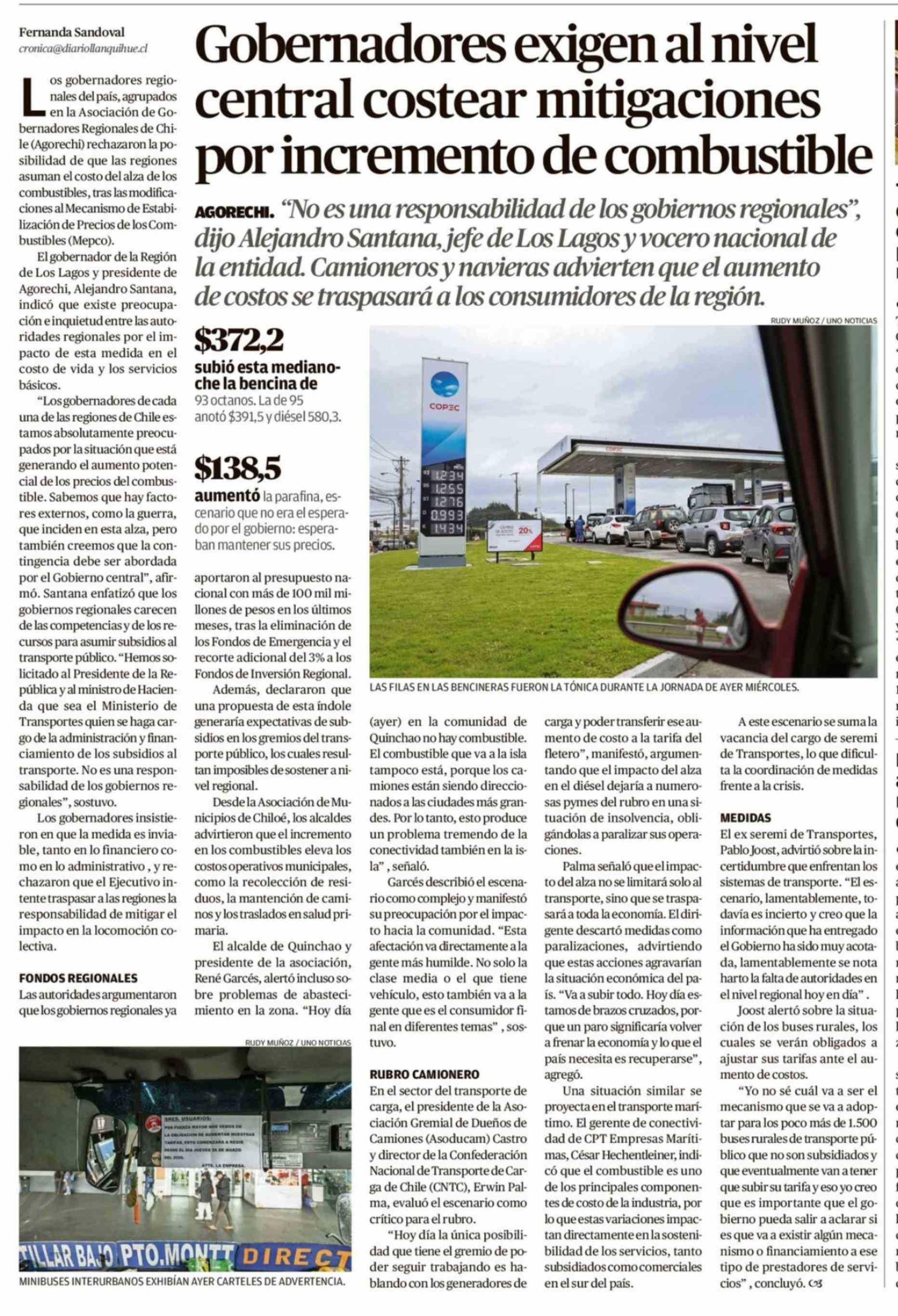 Gobernadores exigen al nivel central costear mitigaciones por incremento de combustible 26-03-2026 El Llanquihue |