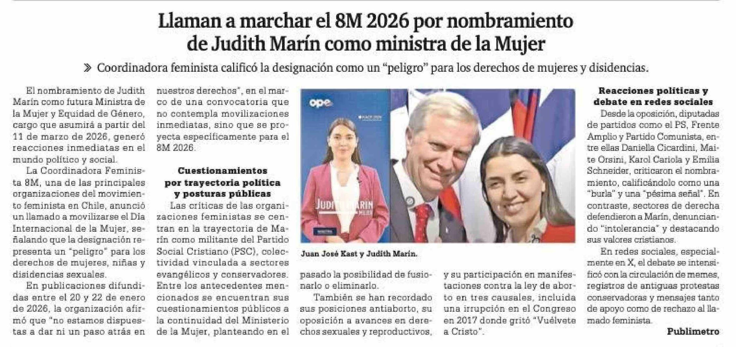 Título: Llaman a marchar el 8M 2026 por nombramiento de Judith Marín como ministra de la Mujer