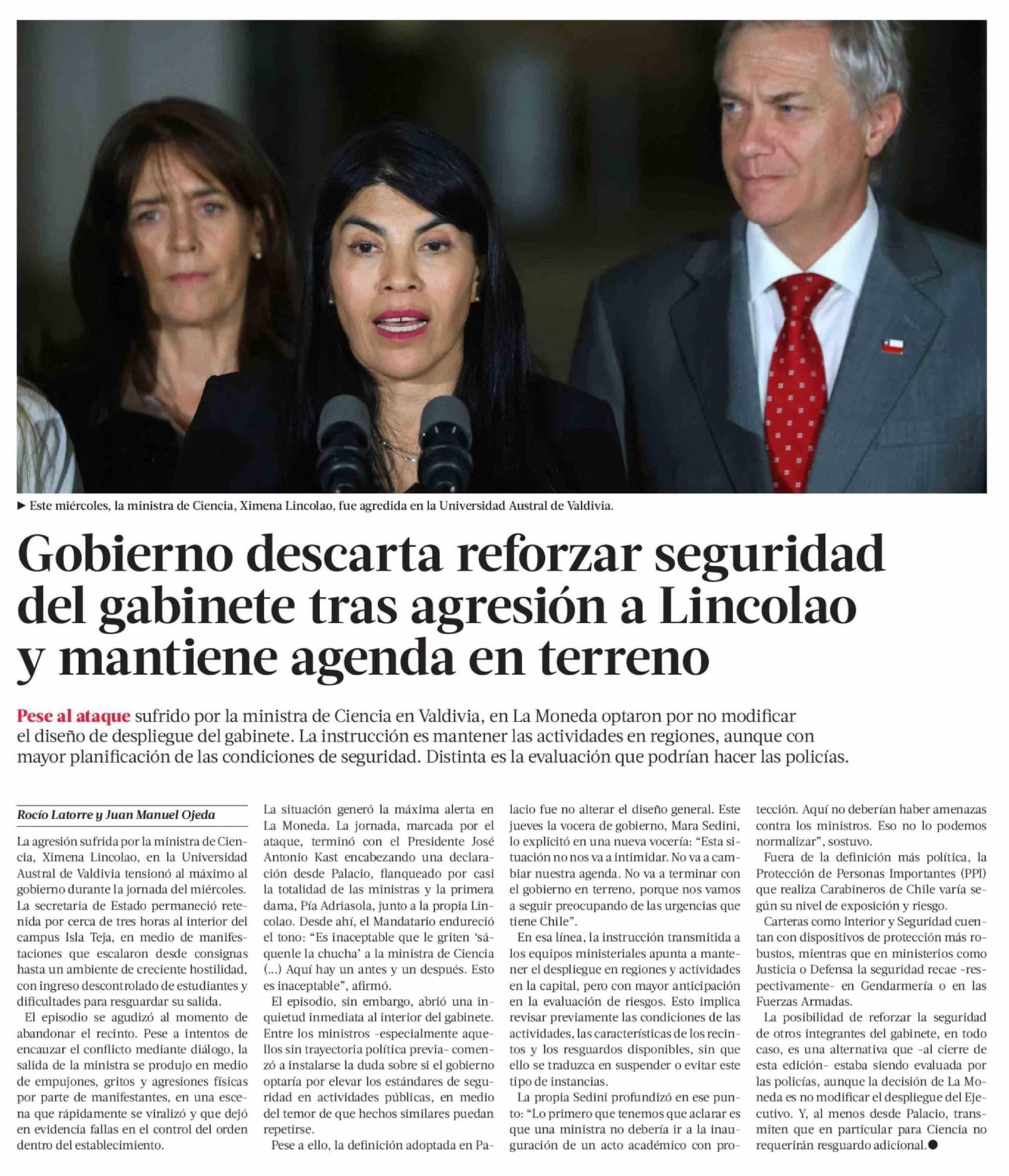 Gobierno descarta reforzar seguridad del gabinete tras agresión a Lincolao y mantiene agenda en terreno 10-04-2026 La Tercera |