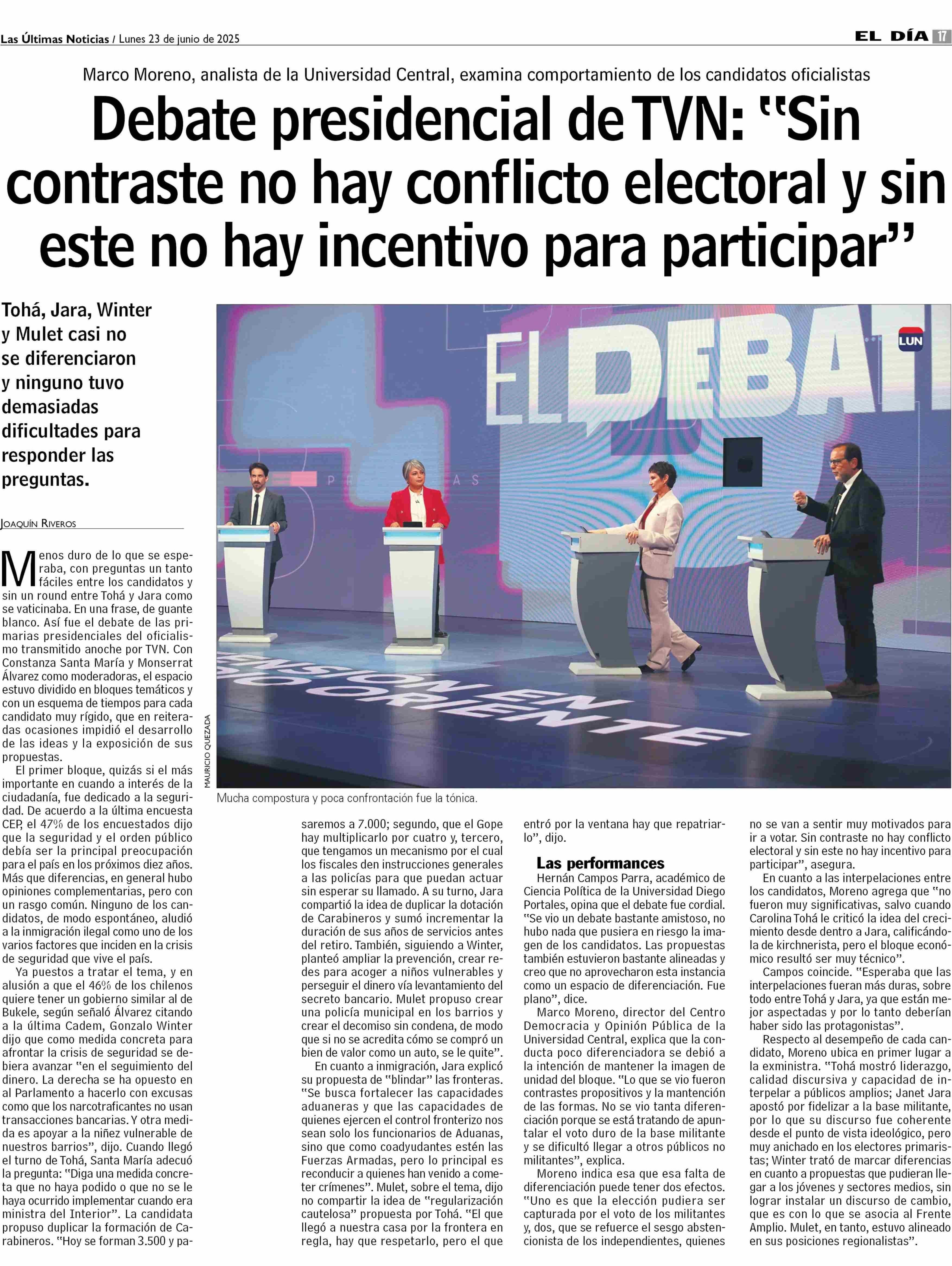 Debate presidencial deTVN: “Sin contraste no hay conflicto electoral y sin este no hay incentivo para participar” 23-06-2025 Las Últimas Noticias |