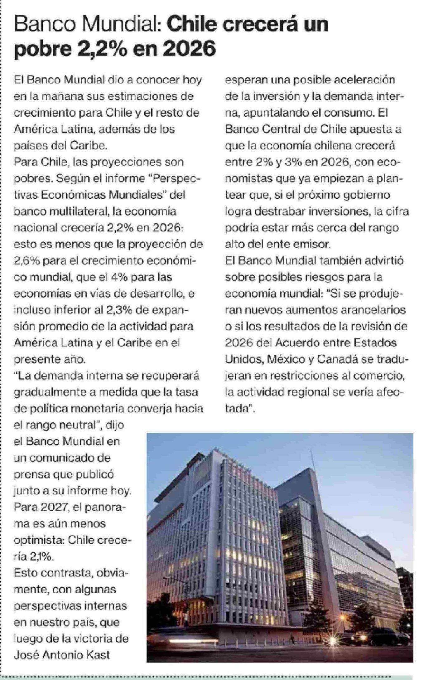 Título: Banco Mundial: Chile crecerá un pobre 2,2% en 2026