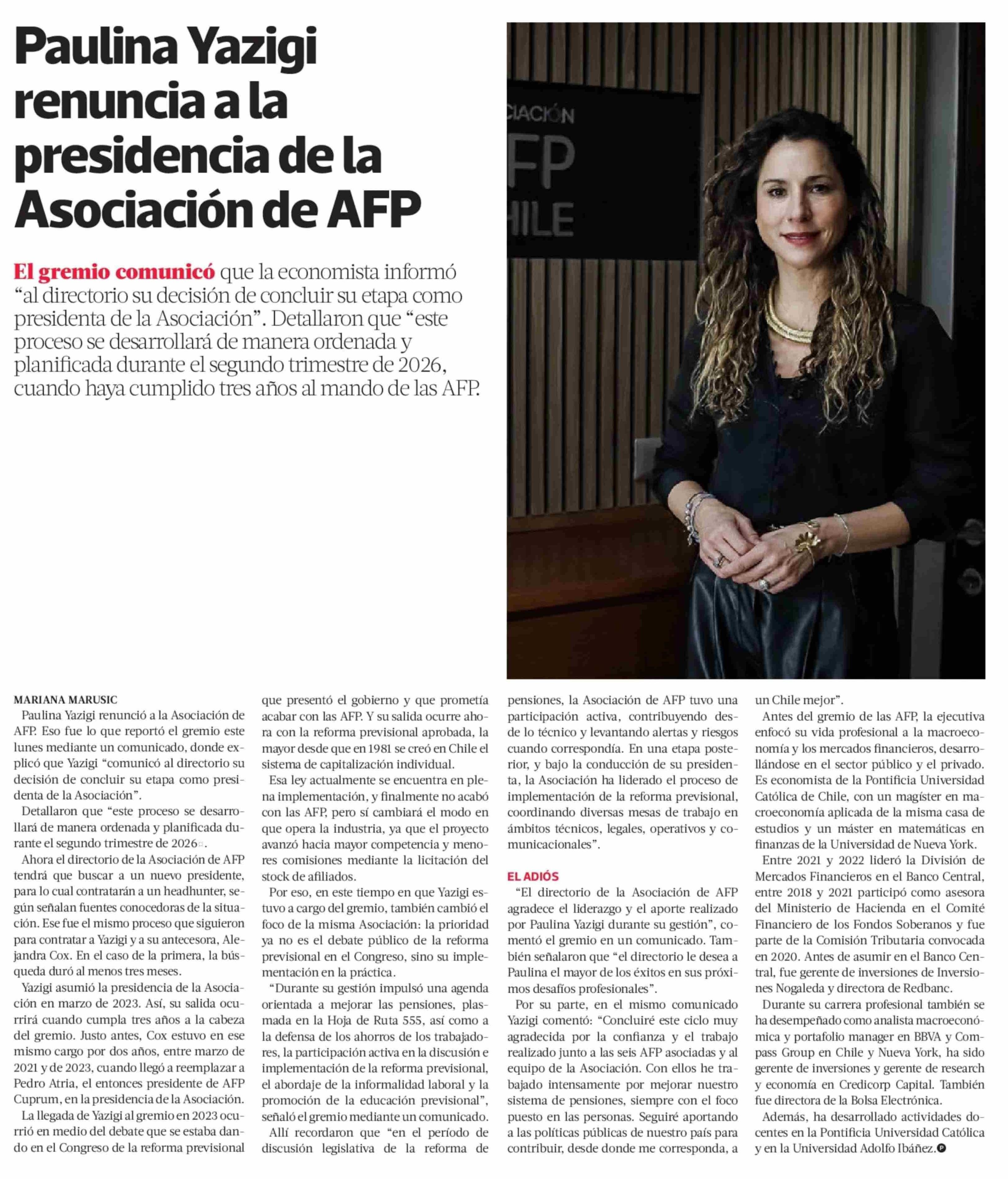 Paulina Yazigi renuncia a la presidencia de la Asociación de AFP 13-01-2026 La Tercera |