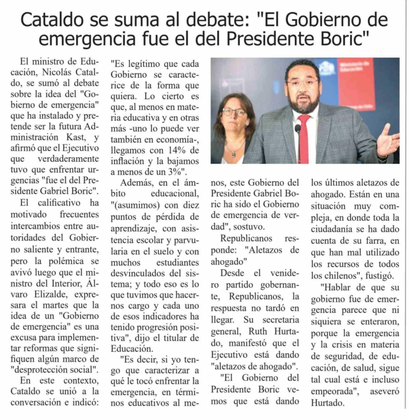 Título: Cataldo se suma al debate: "El Gobierno de emergencia fue el del Presidente Boric"