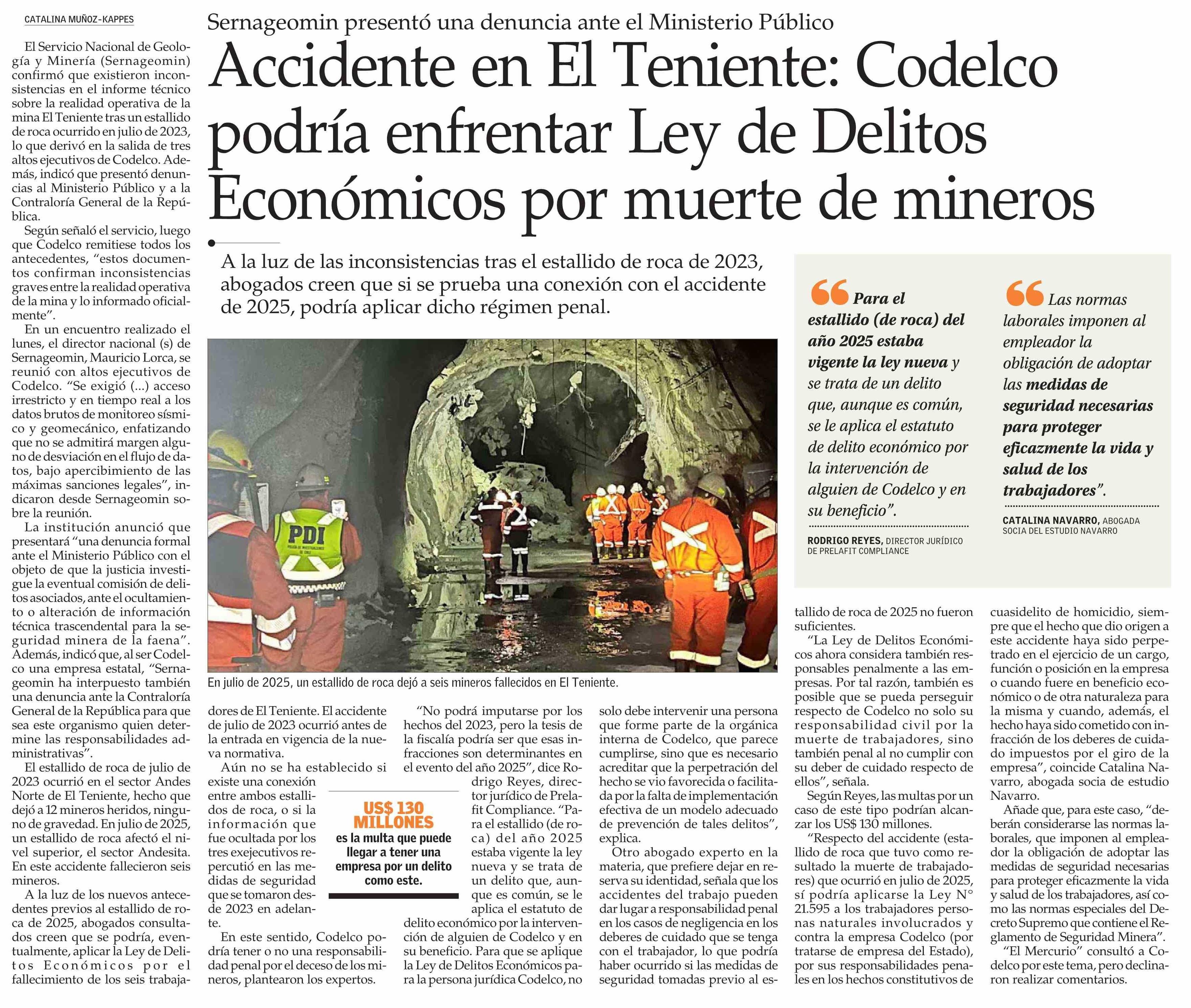 Accidente en El Teniente: Codelco podría enfrentar Ley de Delitos Económicos por muerte de mineros 18-02-2026 El Mercurio |
