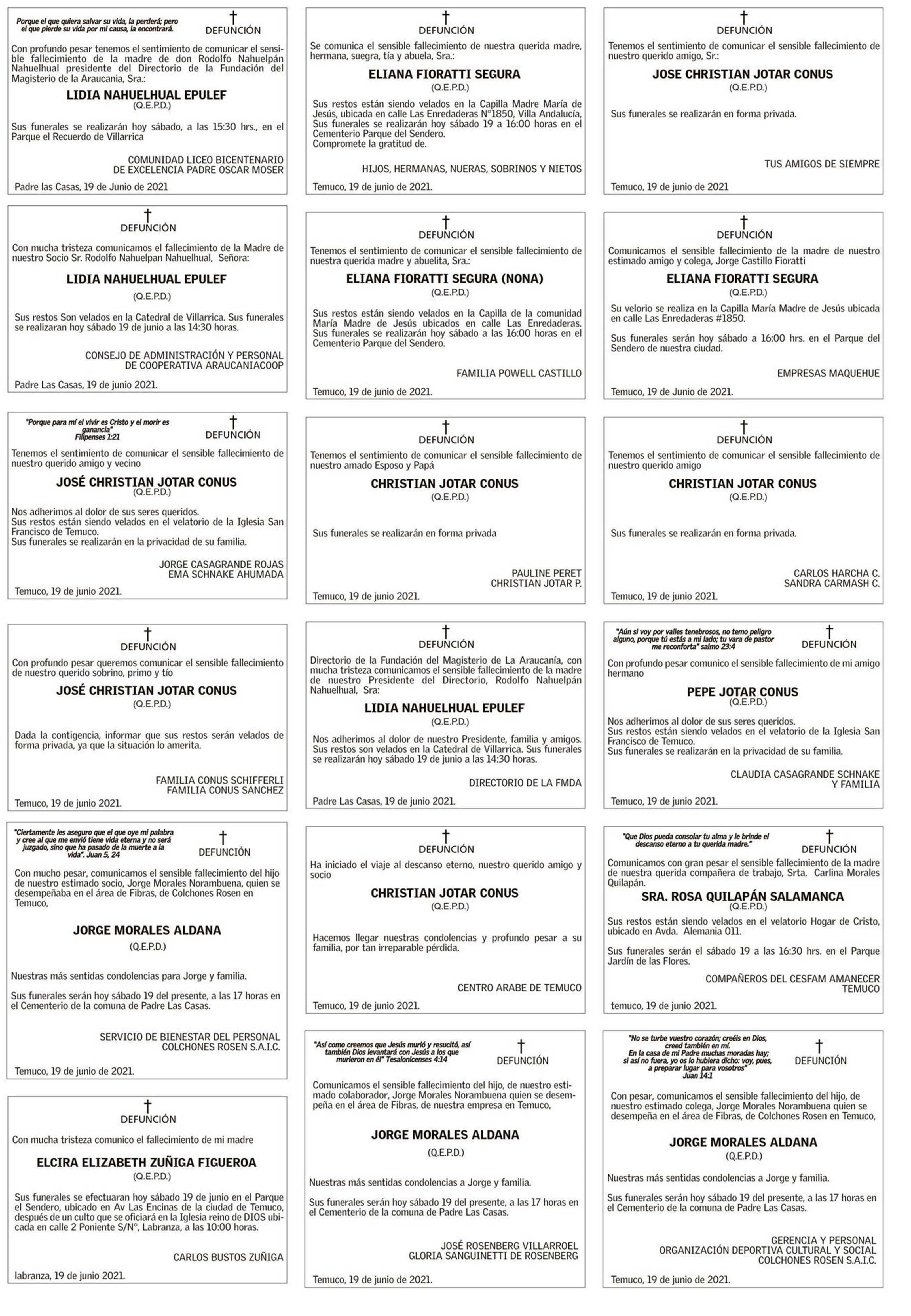 Fecha: 19-06-2021 Sector: Obituario Región: Región de la Araucanía