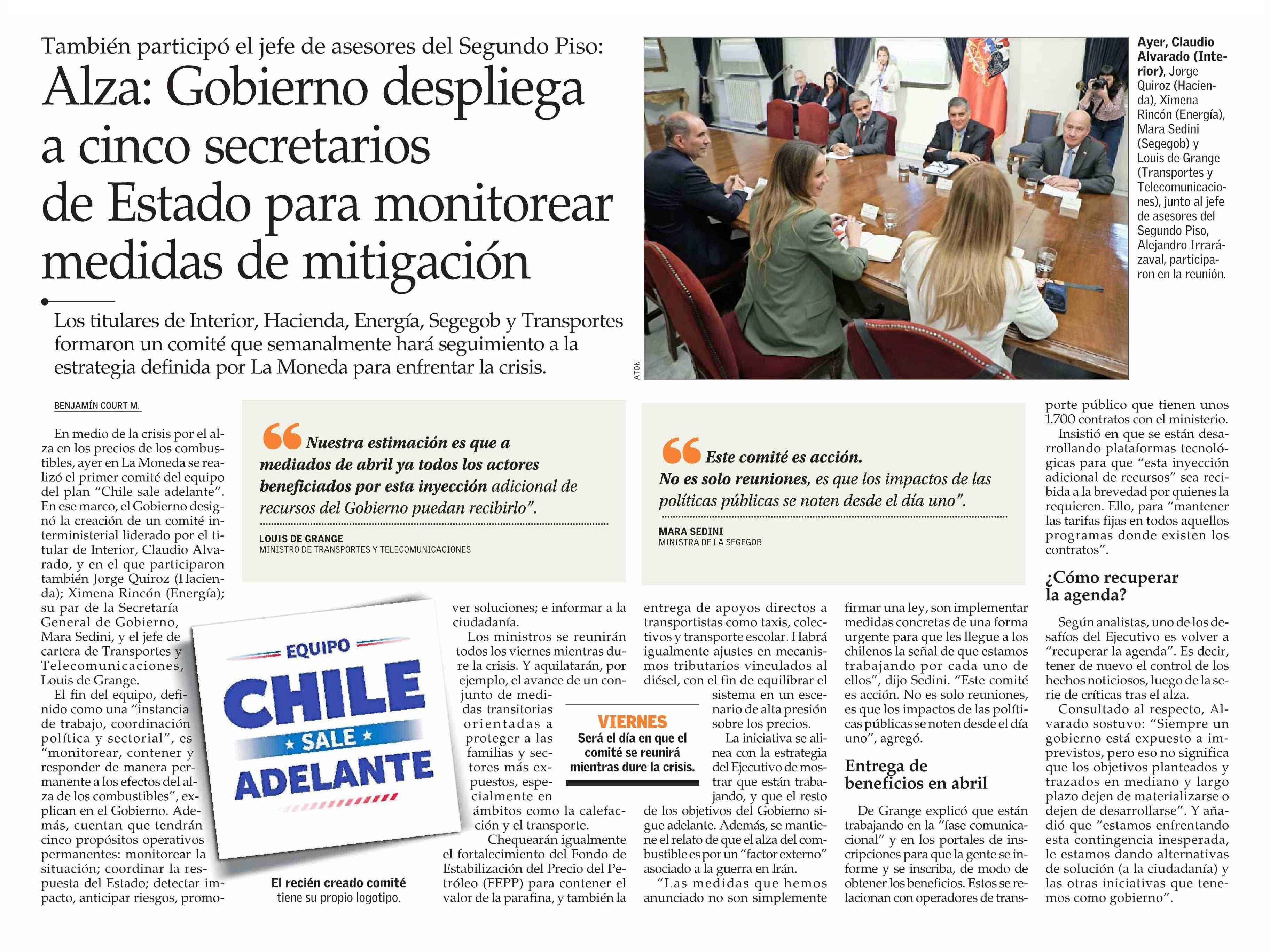 Alza: Gobierno despliega a cinco secretarios de Estado para monitorear medidas de mitigación 28-03-2026 El Mercurio |
