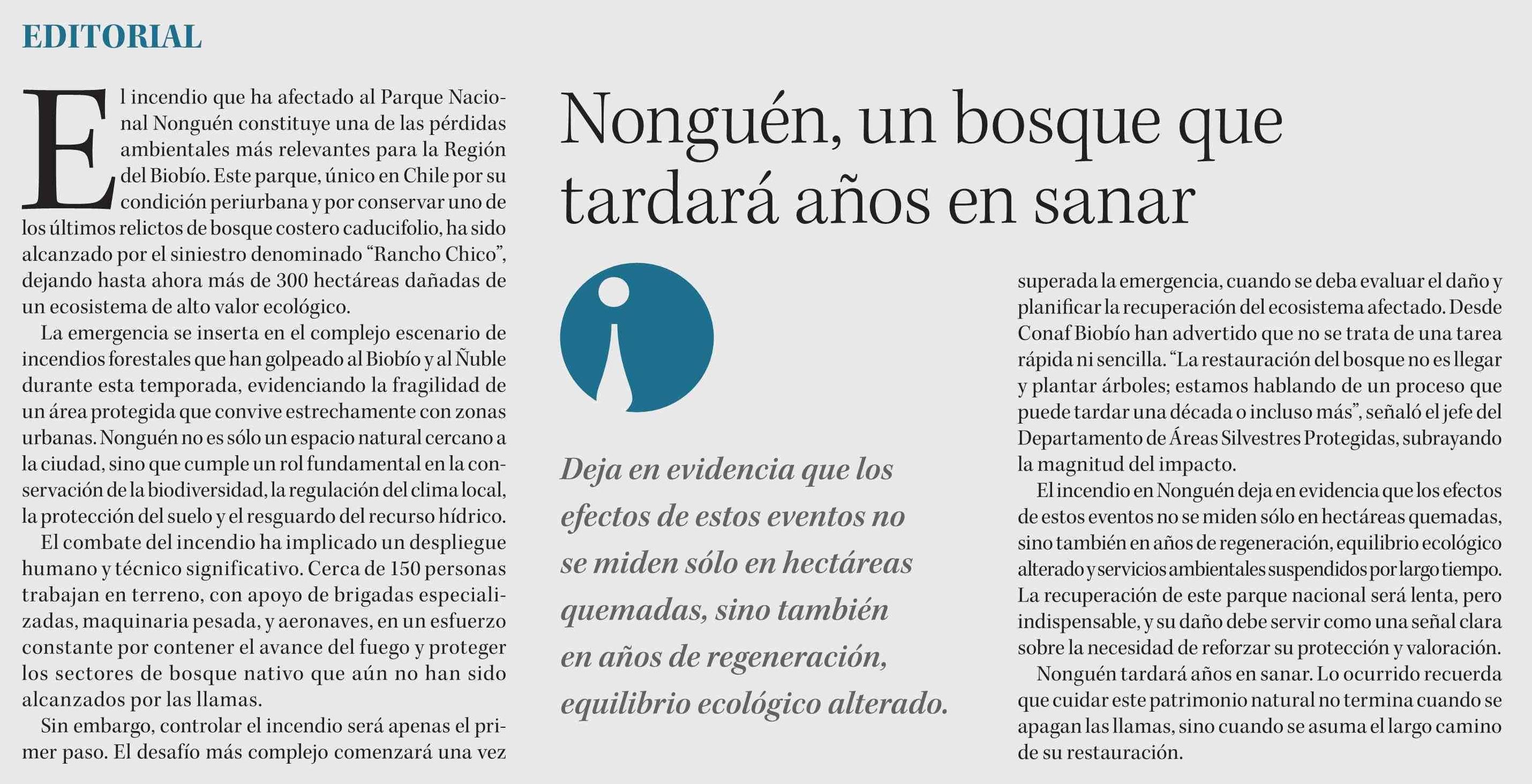 Editorial: Nonguén, un bosque que tardará años en sanar 26-01-2026 Diario Concepción |