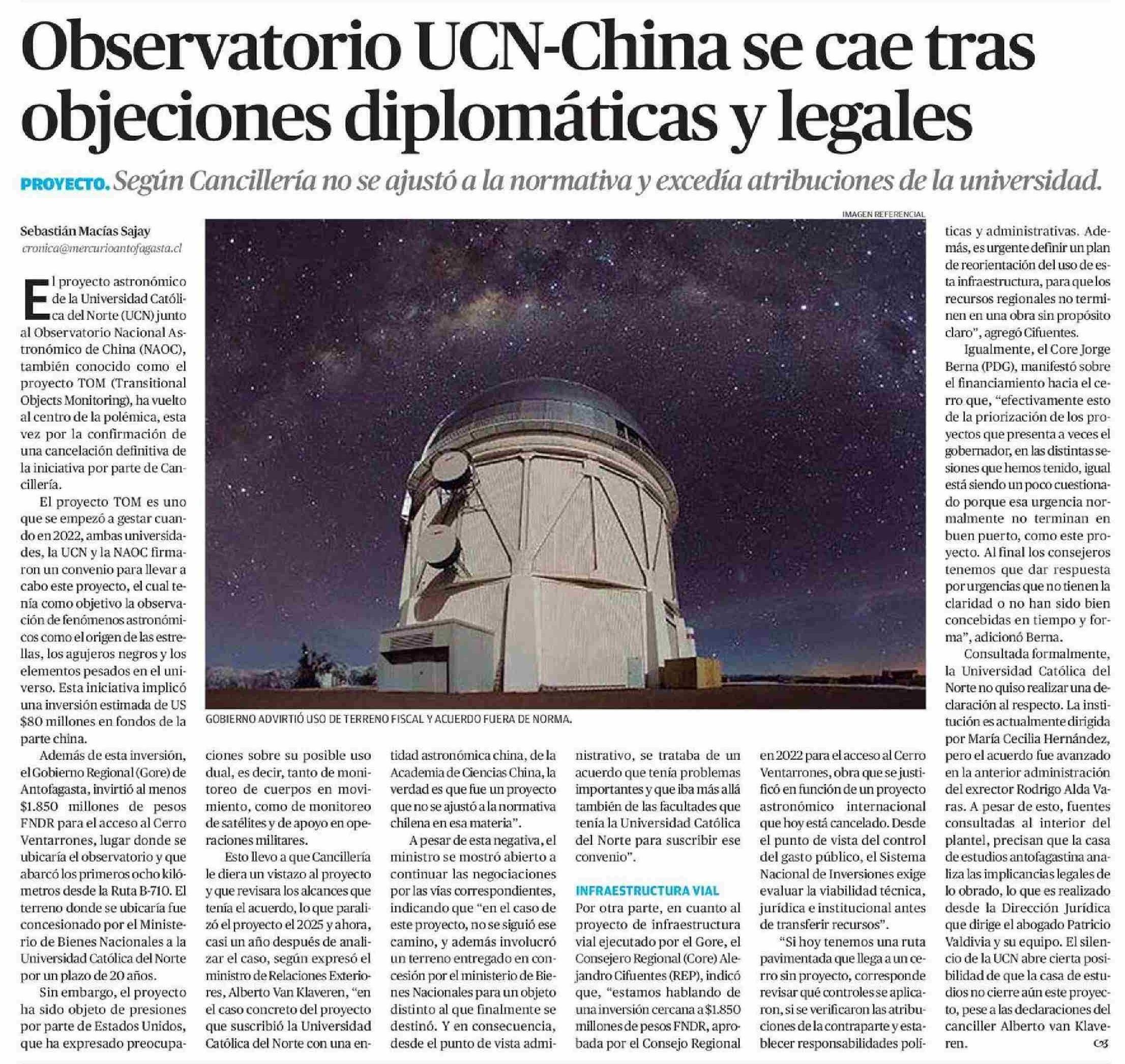 Título: Observatorio UCN-China se cae tras objeciones diplomáticas y legales