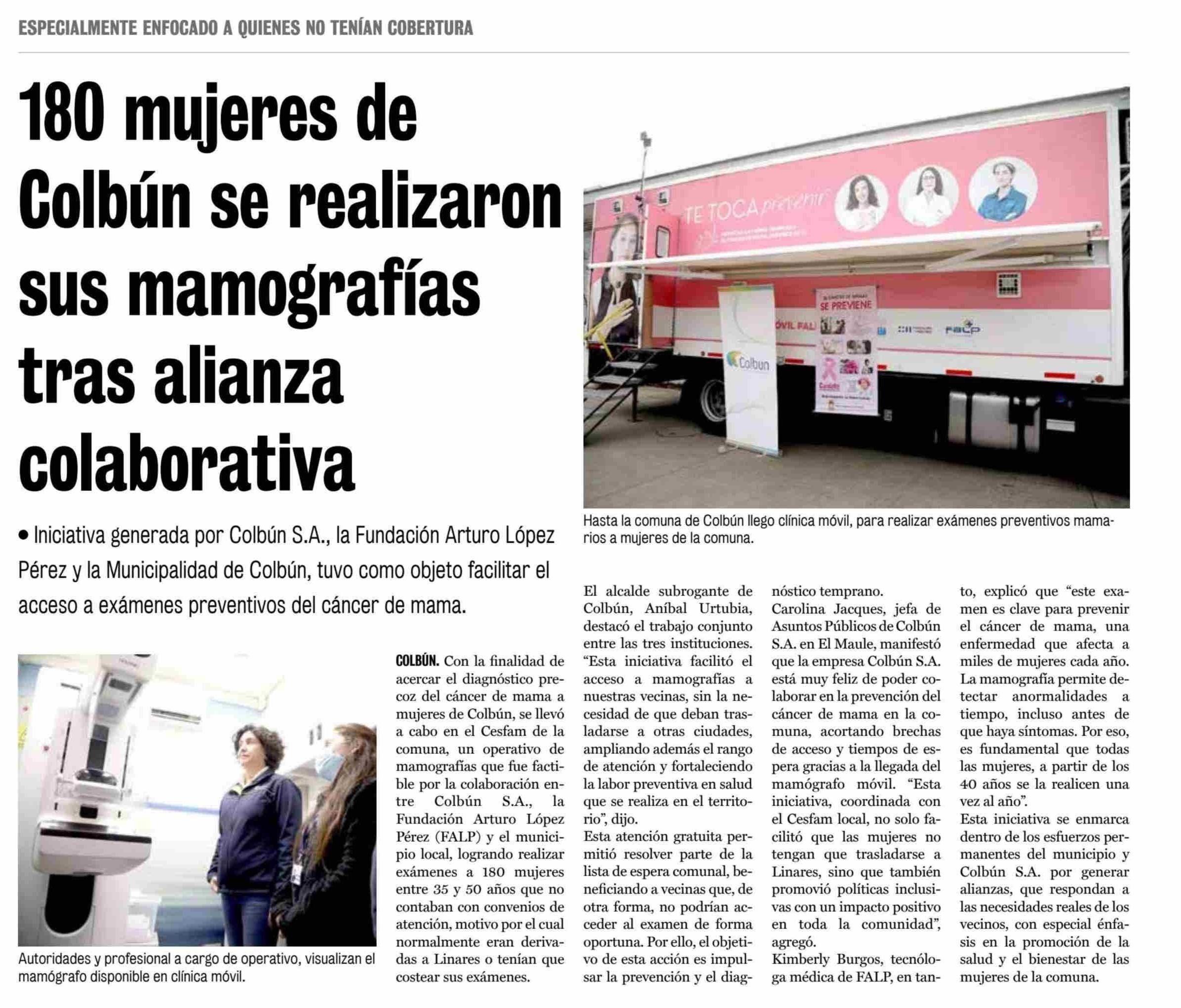 180 mujeres de Colbún se realizaron sus mamografías tras alianza colaborativa 04-05-2025 La Prensa de Curicó |