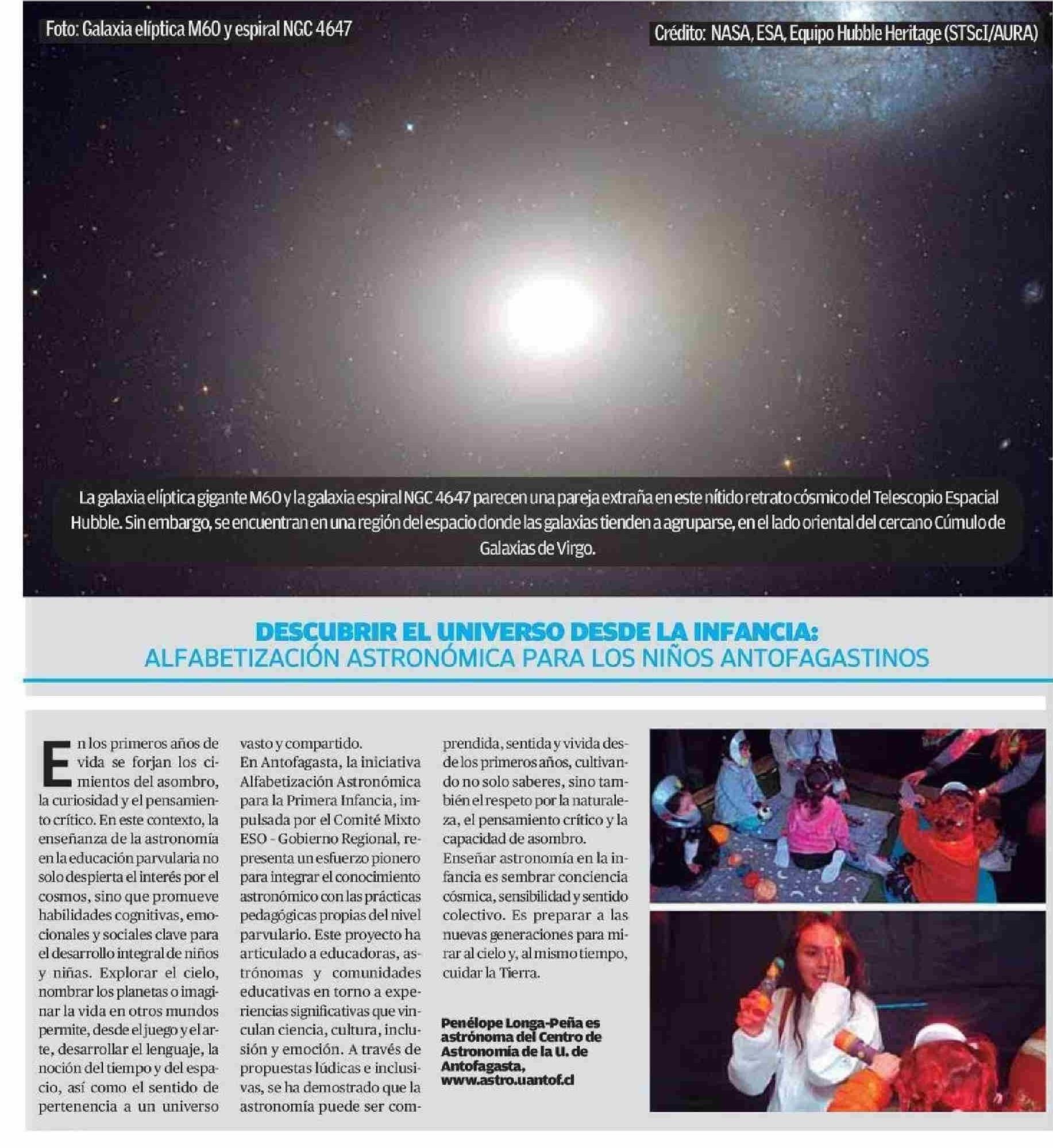 DESCUBRIR EL UNIVERSO DESDE LA INFANCIA: ALFABETIZACIÓN ASTRONÓMICA PARA LOS NIÑOS ANTOFAGASTINOS 19-05-2025 El Mercurio de Calama |