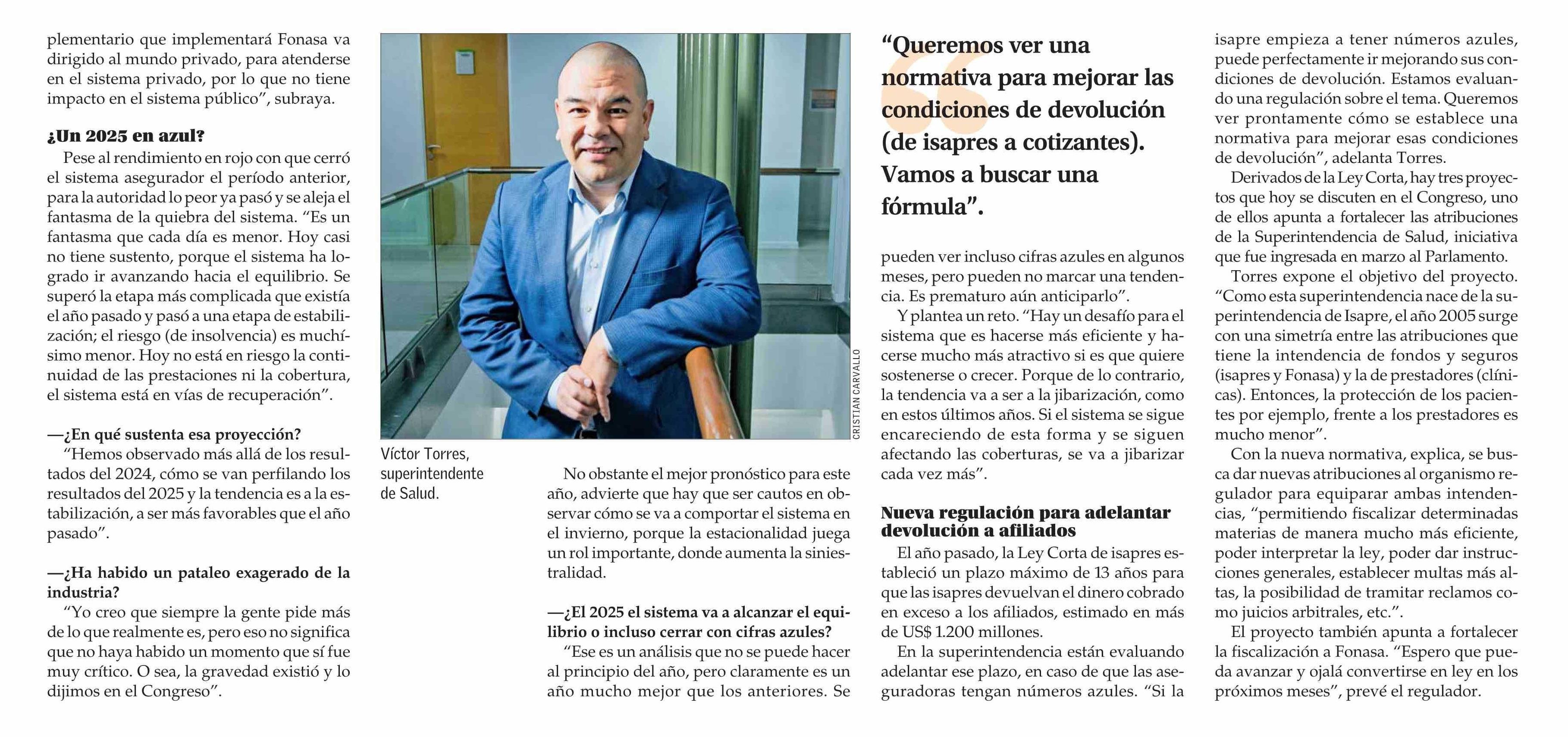 SUPERINTENDENTE DE SALUD ADELANTA QUE ISAPRES PERDIERON $100 mil millones en 2024, pero asegura que lo peor ya pasó 06-04-2025 El Mercurio |
