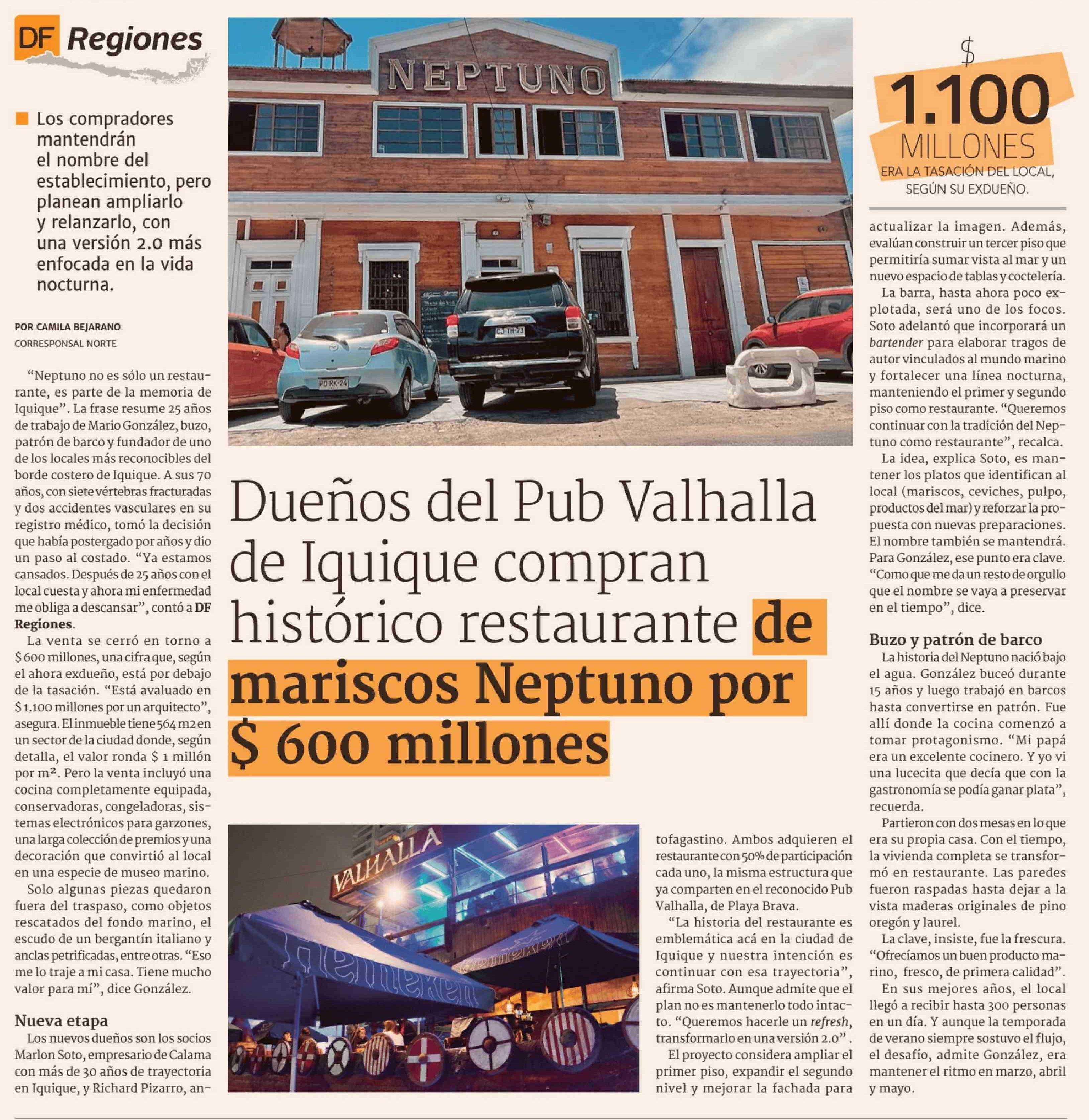 Dueños del Pub Valhalla de Iquique compran histórico restaurante de mariscos Neptuno por $ 600 millones 02-03-2026 Diario Financiero |