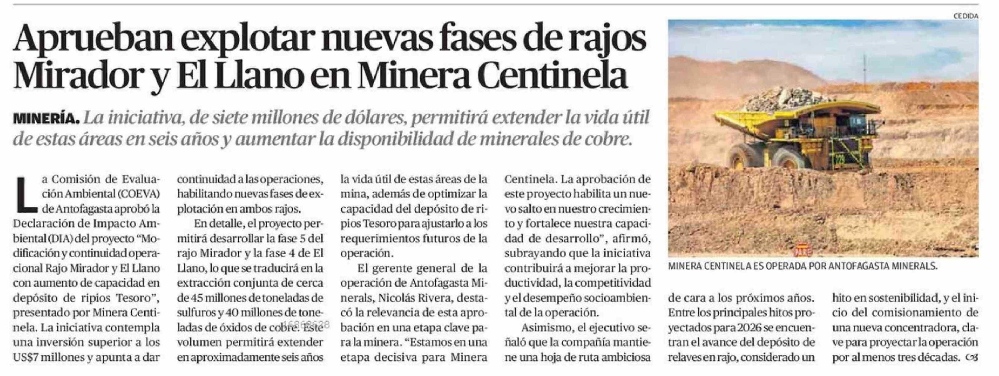Aprueban explotar nuevas fases de rajos Mirador y El Llano en Minera Centinela 10-04-2026 El Mercurio de Calama |