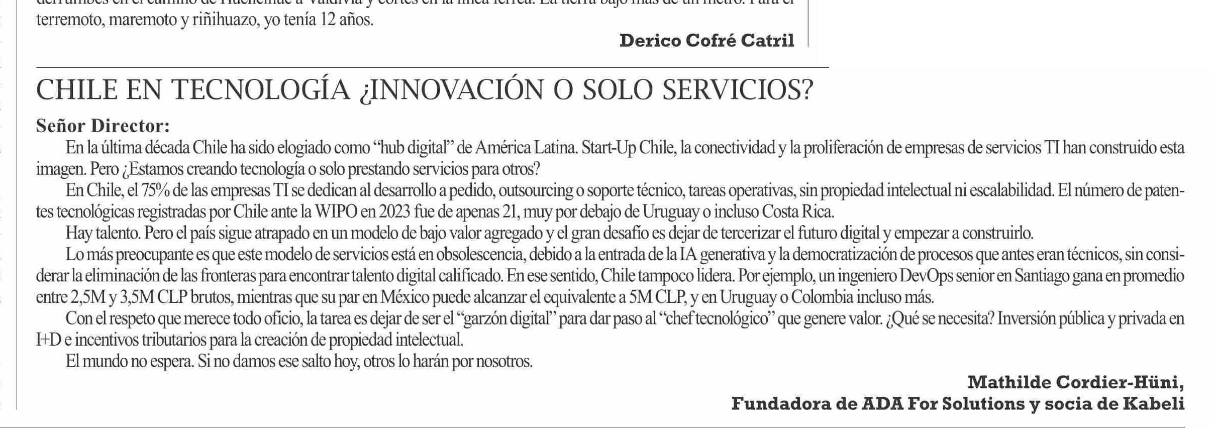 CARTAS: CHILE EN TECNOLOGIA ¿INNOVACIÓN O SOLO SERVICIOS? 27-05-2025 El Pingüino |