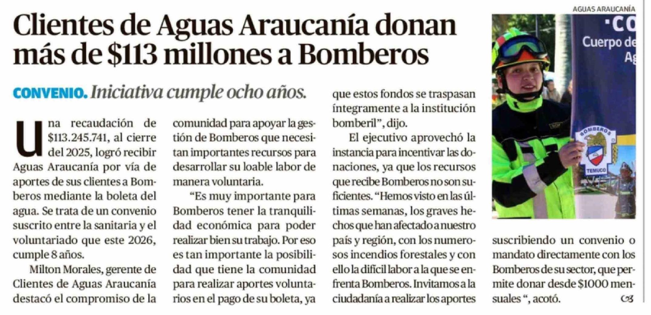 Clientes de Aguas Araucanía donan más de $113 millones a Bomberos 05-02-2026 El Austral de la Araucanía |