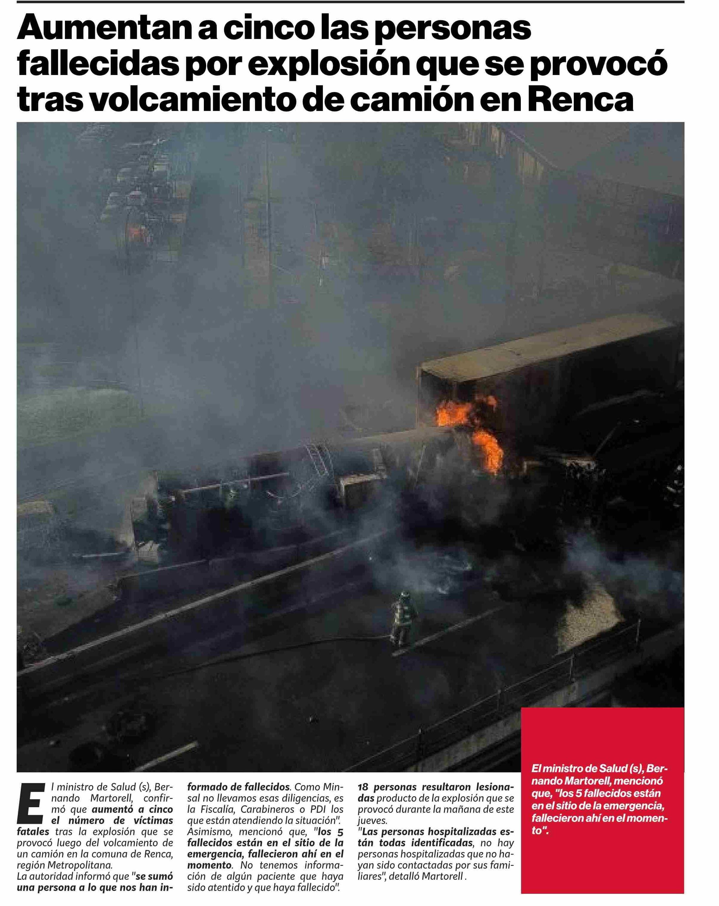 | Título: | Aumentan a cinco las personas fallecidas por explosión que se provocó tras volcamiento de camión en Renca |