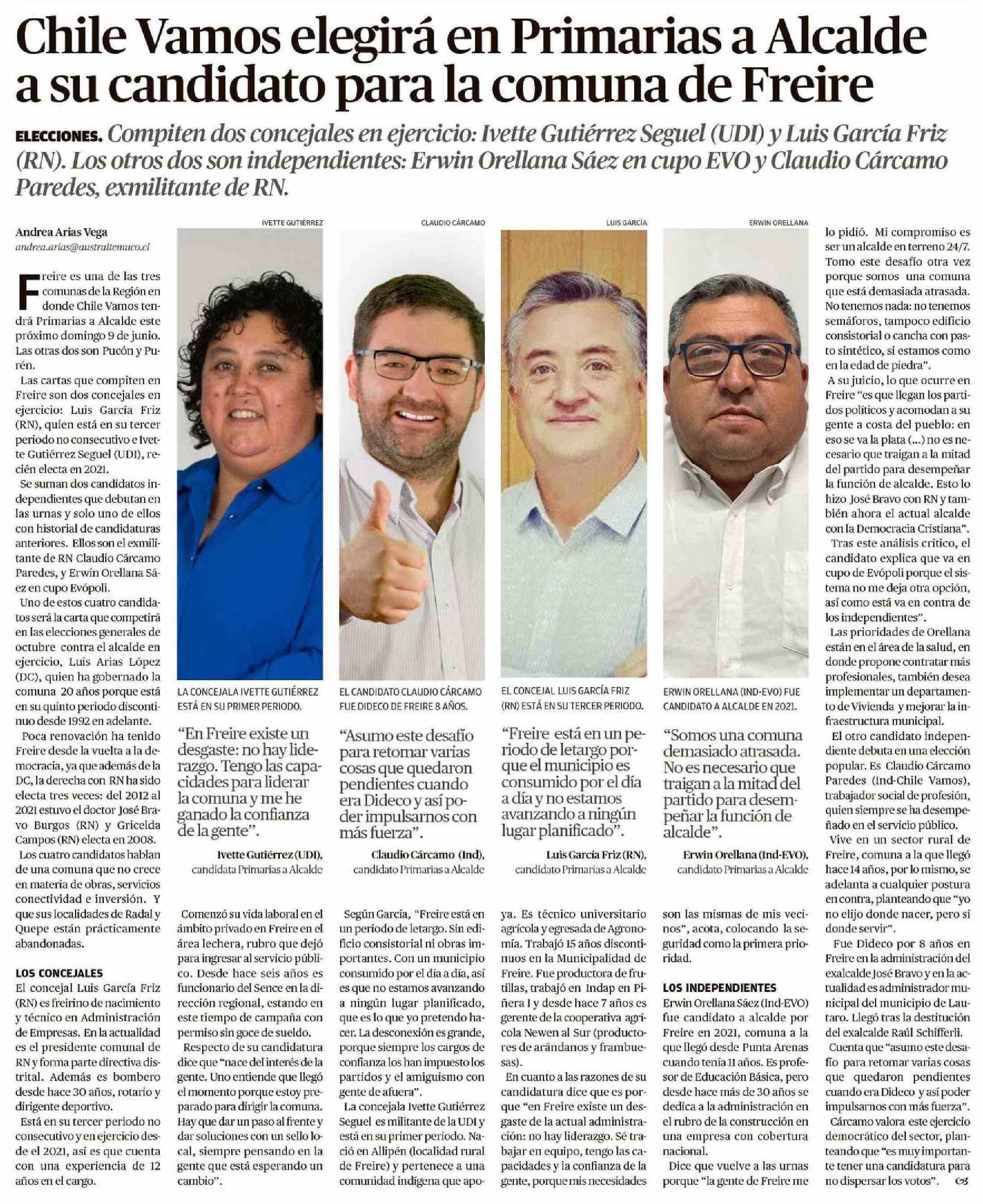 Chile Vamos elegirá en Primarias a Alcalde a su candidato para la comuna de Freire 07-06-2024 El Austral de la Araucanía |