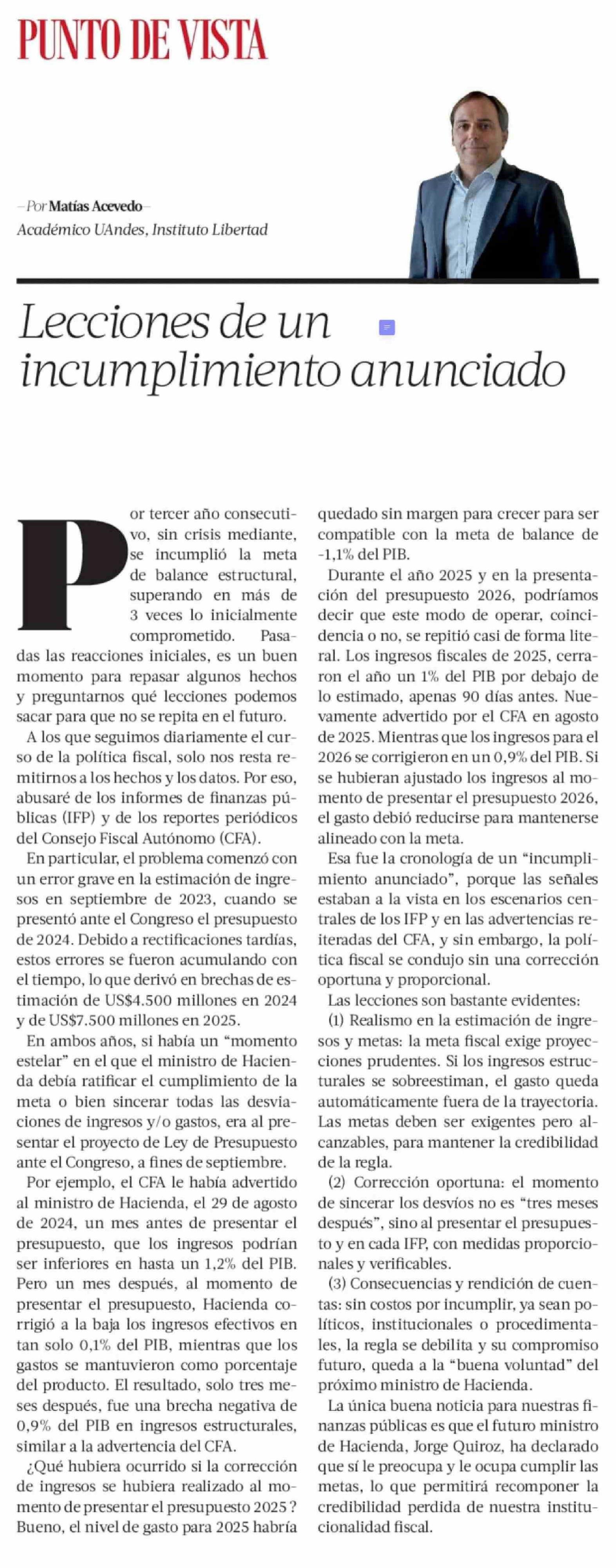 Columnas de Opinión: Lecciones de un incumplimiento anunciado 01-03-2026 La Tercera |